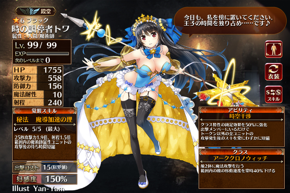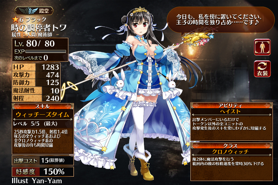 | ブ ラ ッ ク | ![]() 時の調停者トワ | クロノウィッチ | Lv1 | 616 | 169 | 51 | 10 | 220 | 18 | 15 | 攻撃力+180 射程+20 スキル効果時間+25% | ウィッチーズタイム | ヘイスト | 編 集 |