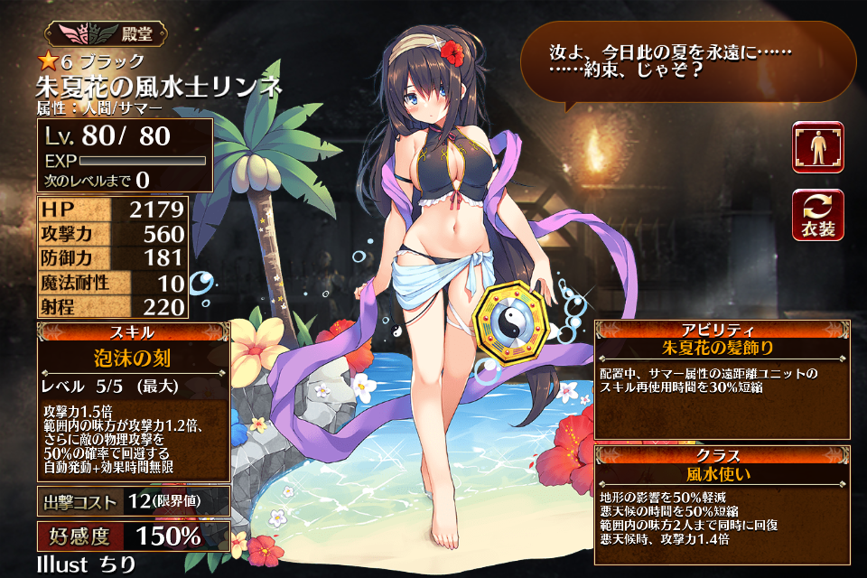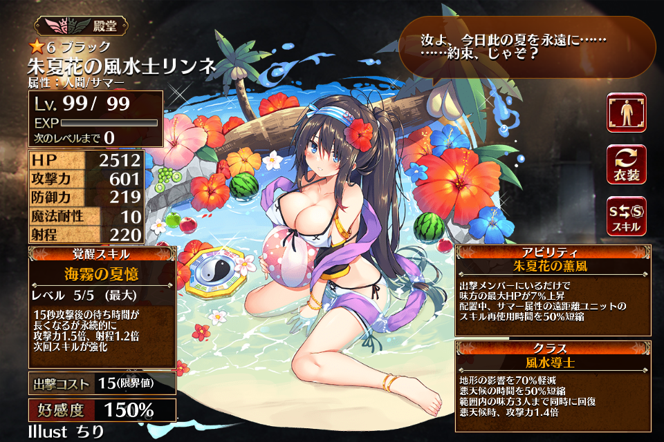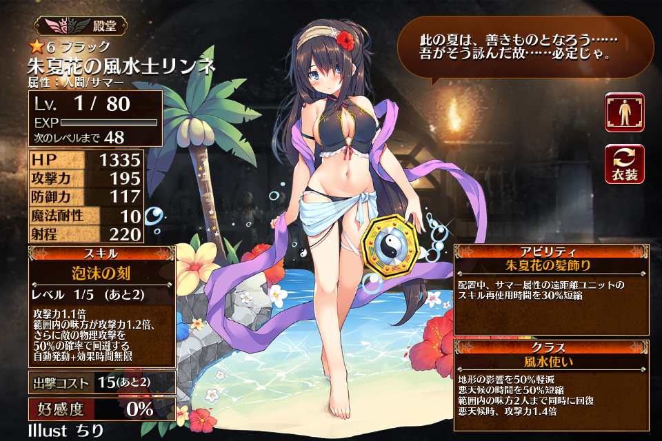 ただいま情報提供所にて情報募集中です。2023/06/29に水着プレミアム召喚限定排出ユニットとして実装された、レアリティブラックの風水使い。