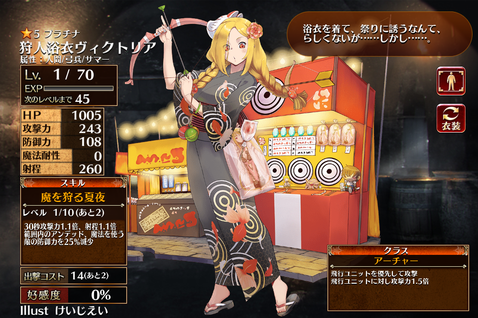 召喚枠のプラチナアーチャーである魔狩人ヴィクトリアのサマー属性・浴衣バージョンである。