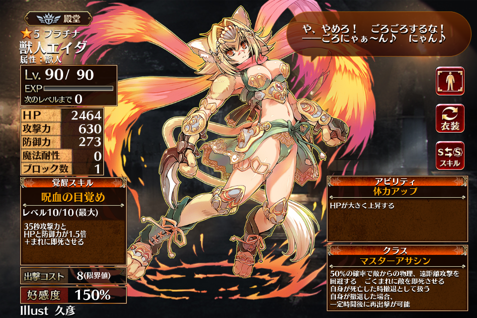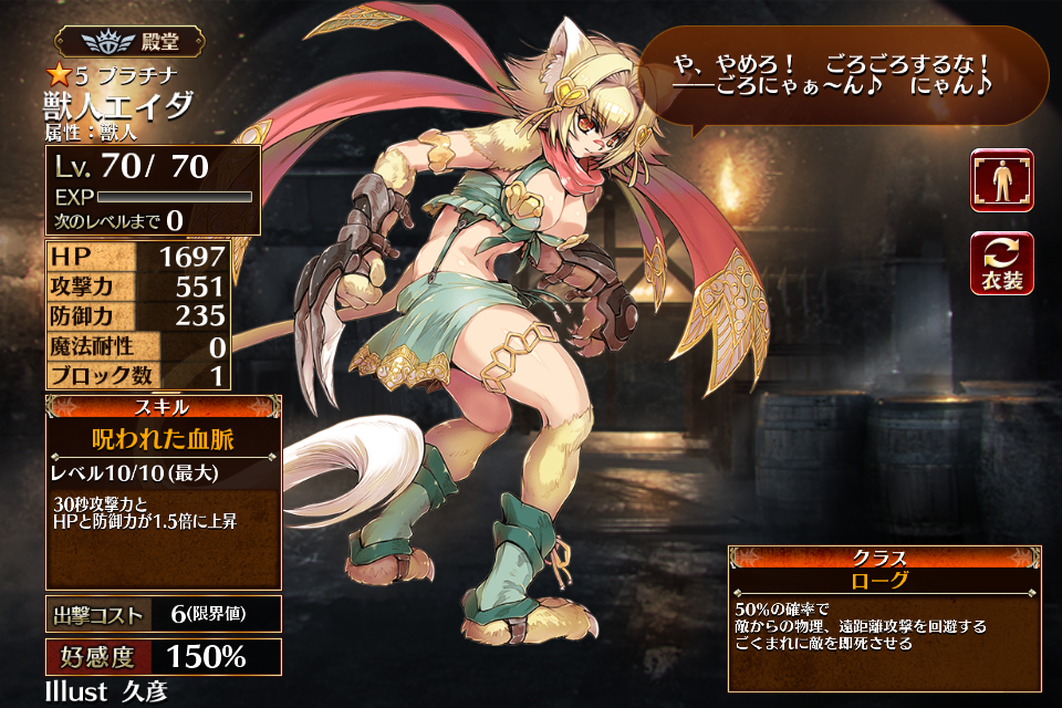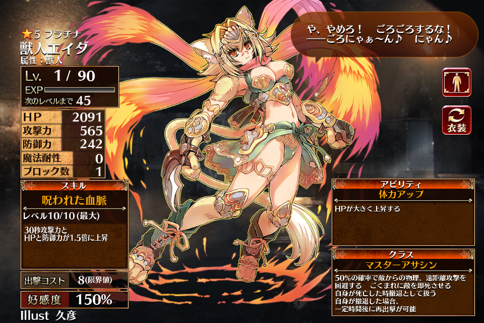 属性:獣人を持つユニットのひとりで、現在はイベントヒストリー・1年目の戦いから恒常的に入手できるようになっている。