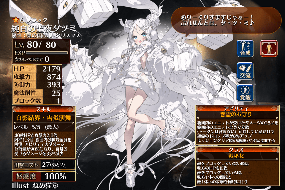 | Lv2 | 40ÉÃHP¤È¹¶·âÎÏ1.6ÇÜ¡¡¼ÍÄø1.3ÇÜ¡¡ÈÏ°ÏÆâ¤ÎÌ£ÊýÁ´°÷¤ò²óÉü ¥¢¥Ó¥ê¥Æ¥£¤Î¥À¥á¡¼¥¸Ê¬»¶Î̤¬90¡ó¤Ë¤Ê¤ê¡¢¼«¿È¤Î¼õ¤±¤ë¥À¥á¡¼¥¸¤ò33¡ó¸º¾¯ | ¶ä | ¶â | ÀÄ | Çò | 1 | ºÆ | |||