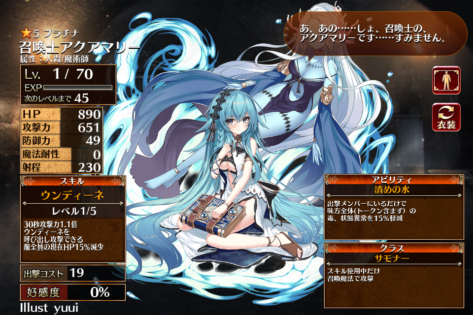 | ウンディーネ | Lv1 | 30秒攻撃力1.9倍 ウンディーネを呼び出し攻撃できる 敵全員の現在HP15%減少 | - | - | - | 15 | - | 29 | 召喚士アクアマリー | 編 集 |