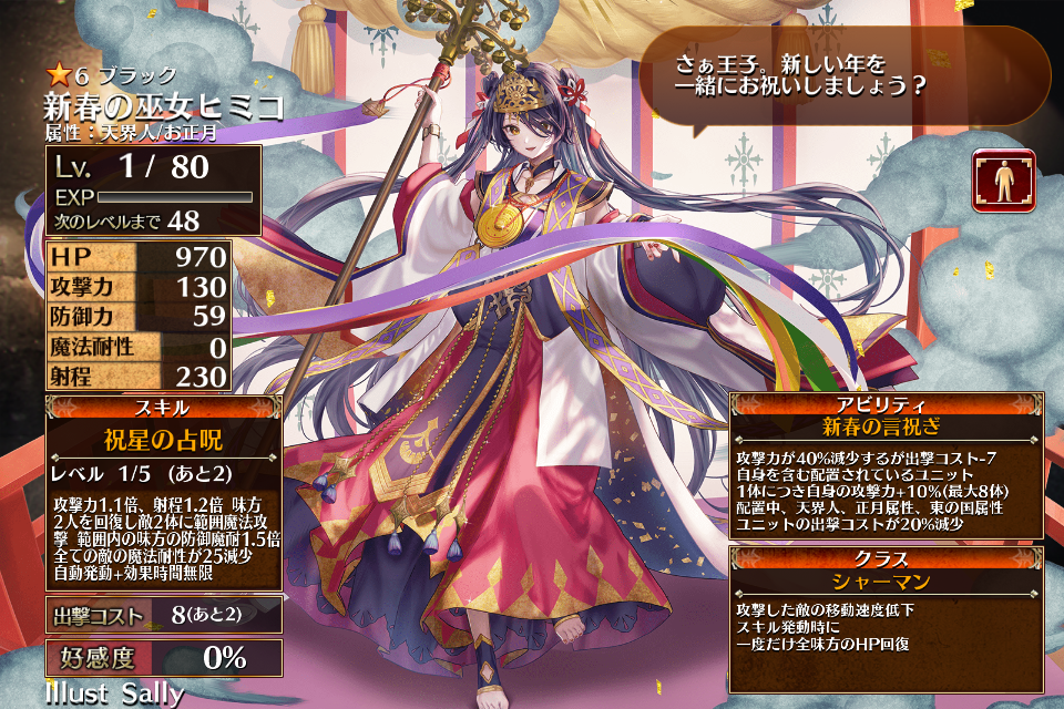 | ブ ラ ッ ク | ![]() 新春の巫女ヒミコ | シャーマン | Lv1 | 970 | 130 | 59 | 0 | 230 | 8 | 5 | ??+?? ??+?? ??+?? | 祝星の占呪 | 新春の言祝ぎ | 編 集 |