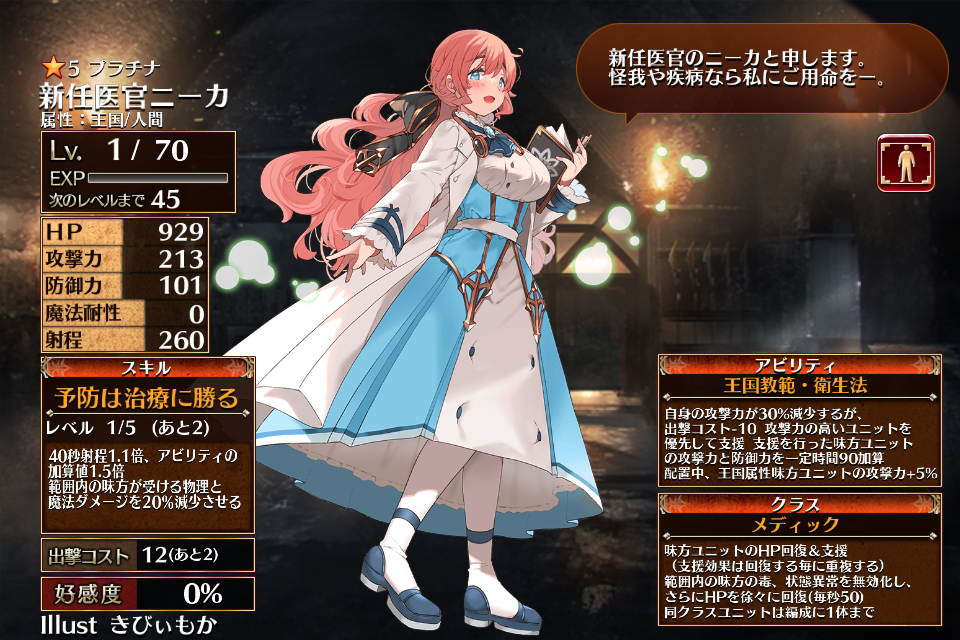 | 予防は治療に勝る | Lv1 | 40秒射程1.1倍、アビリティの加算値1.5倍 範囲内の味方が受ける物理と魔法ダメージを20%減少させる | 銀 | 金 | 青 | 25 | 黒 | 49 | 新任医官ニーカ | 編 集 |