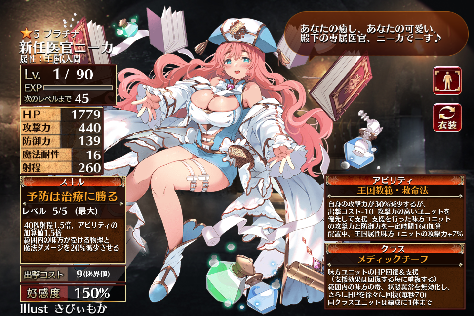 | プ ラ チ ナ | ![]() 新任医官ニーカ | メディック | Lv1 | 929 | 213 | 101 | 0 | 260 | 12 | 9 | HP+360 攻撃力+101 魔法耐性+16 | 予防は治療に勝る | 王国教範・衛生法 | 編 集 |