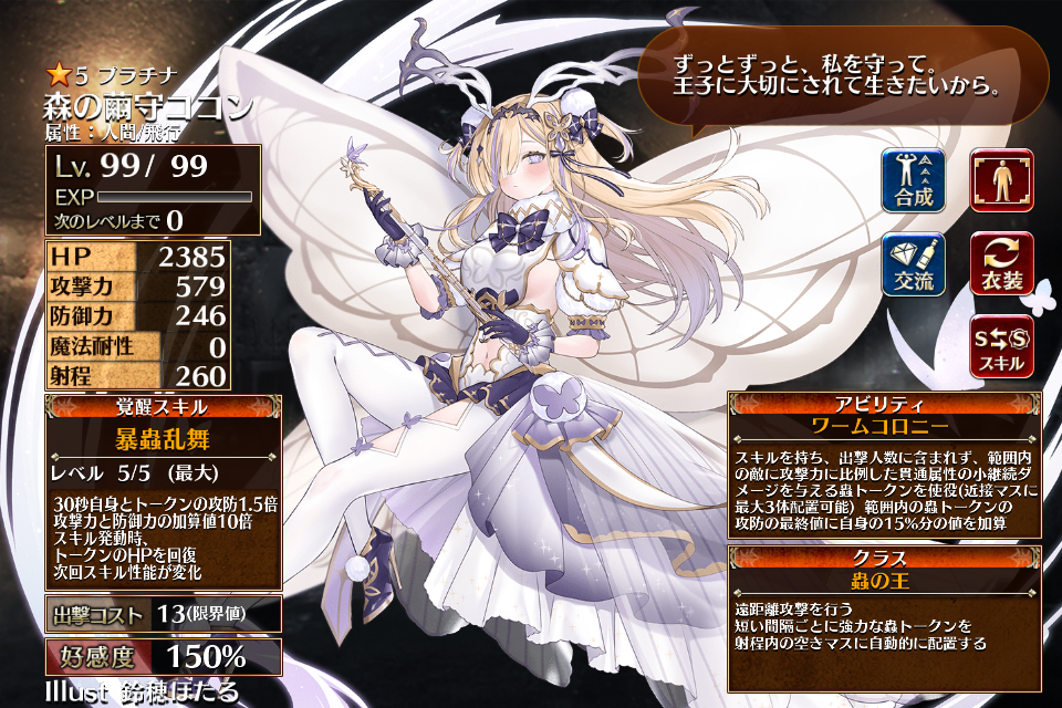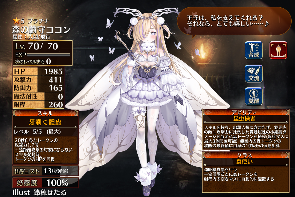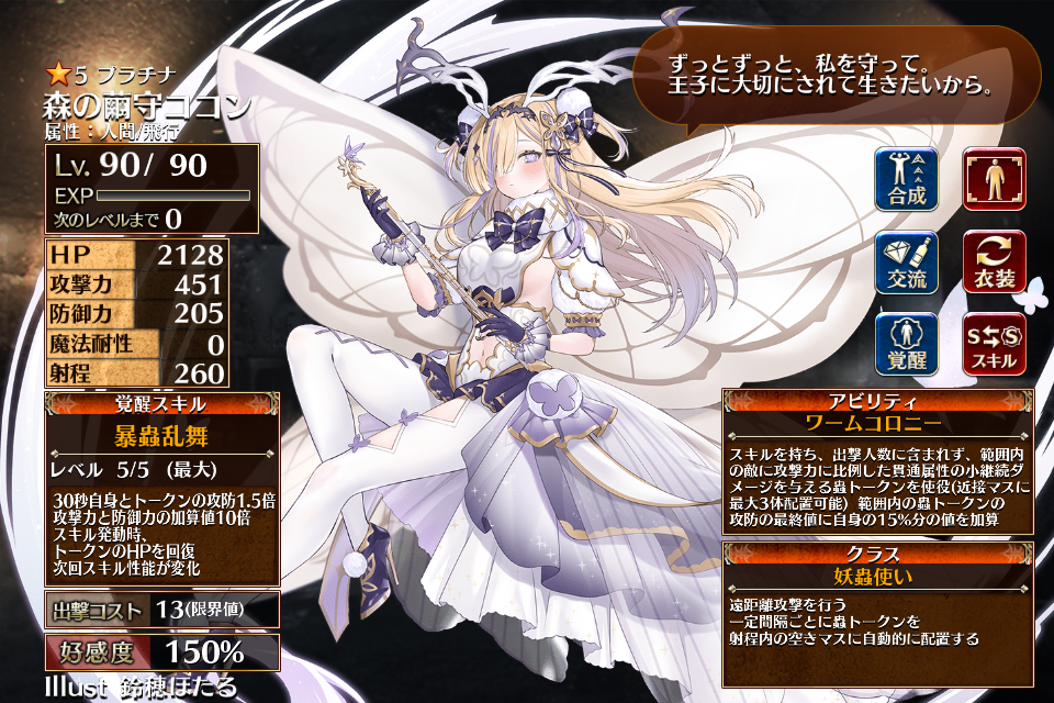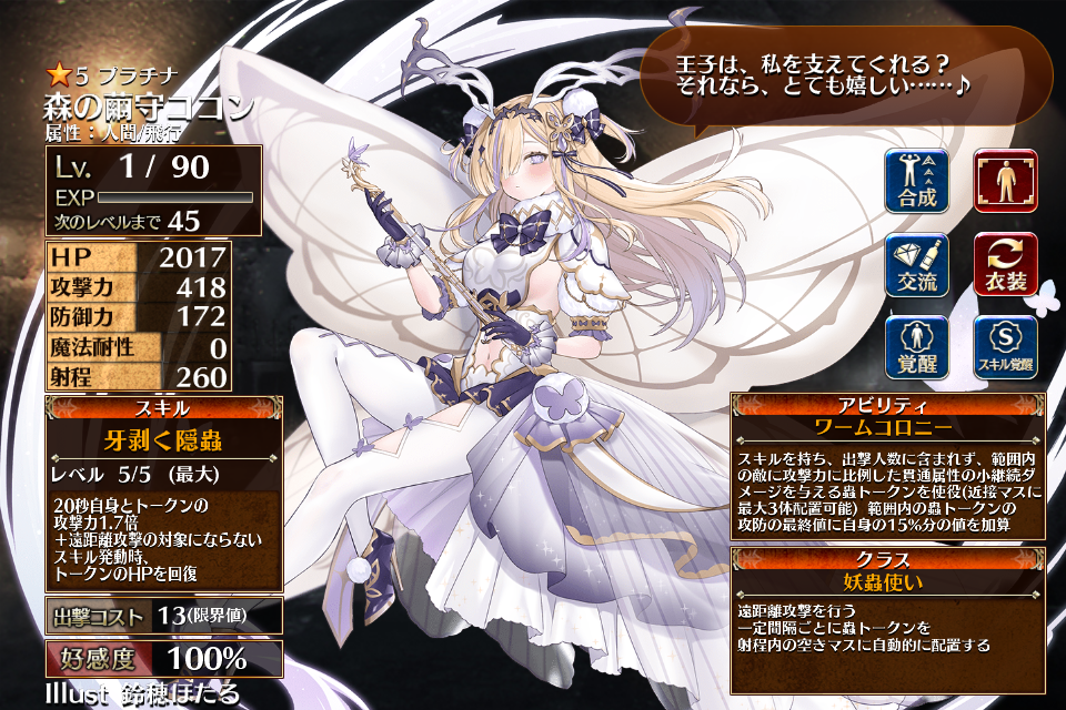 | プ ラ チ ナ | ![]() 森の繭守ココン | 蟲使い | Lv1 | H | 攻 | 防 | 0 | 260 | 16 | 13 | HP+540 攻撃力+108 スキル再使用時間-20% | 牙剥く隠蟲 | 昆虫操者 | 編 集 |