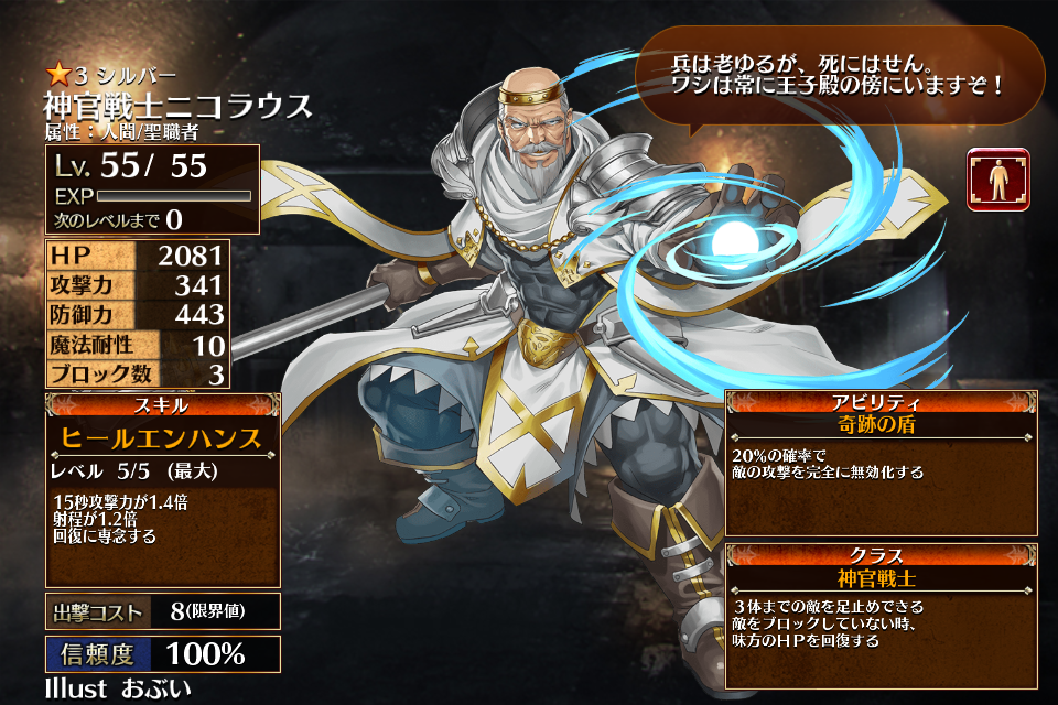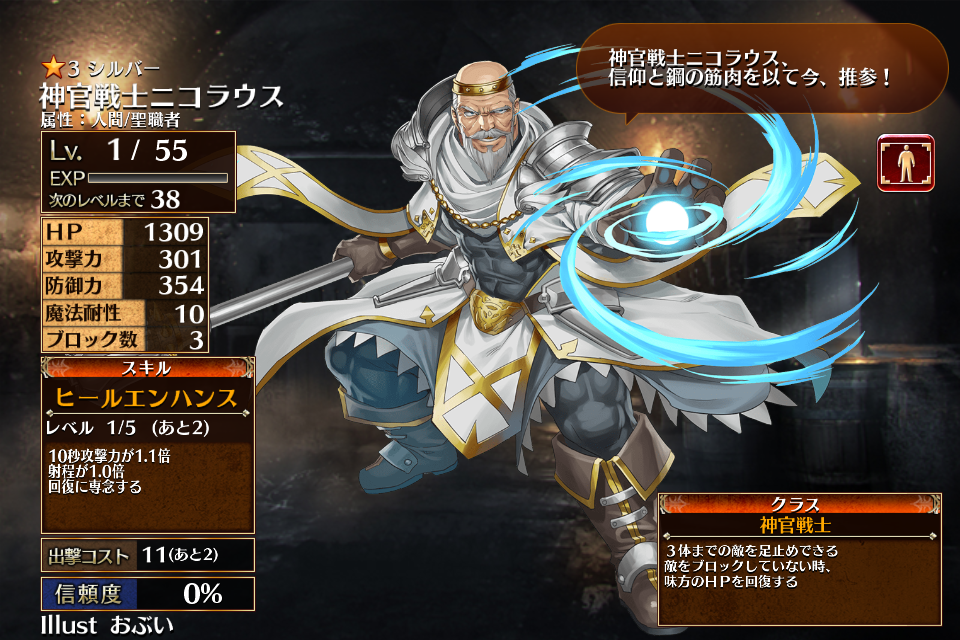 | ヒールエンハンス | Lv1 | 10秒攻撃力が1.1倍 射程が1.0倍 回復に専念する | 34 | - | - | 17 | - | 34 | 神官戦士フラメル 神官戦士ニコラウス | 編 集 |