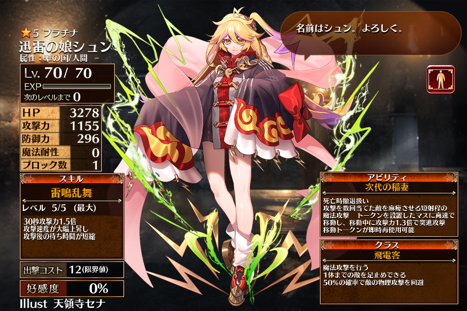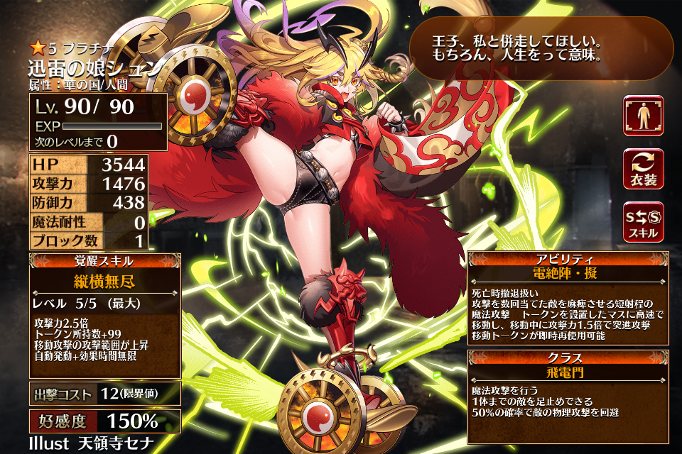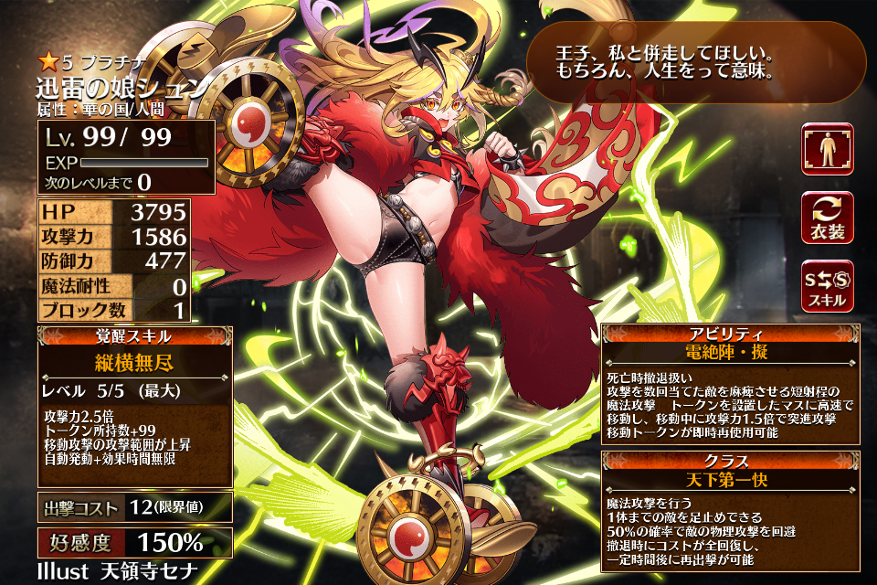 | 通常 | 雷鳴乱舞 | 30秒攻撃力1.5倍 攻撃速度が大幅上昇し攻撃後の待ち時間が短縮 | 初動まで15秒 | 回復まで30秒 |