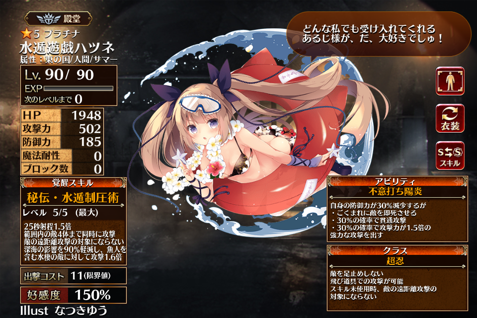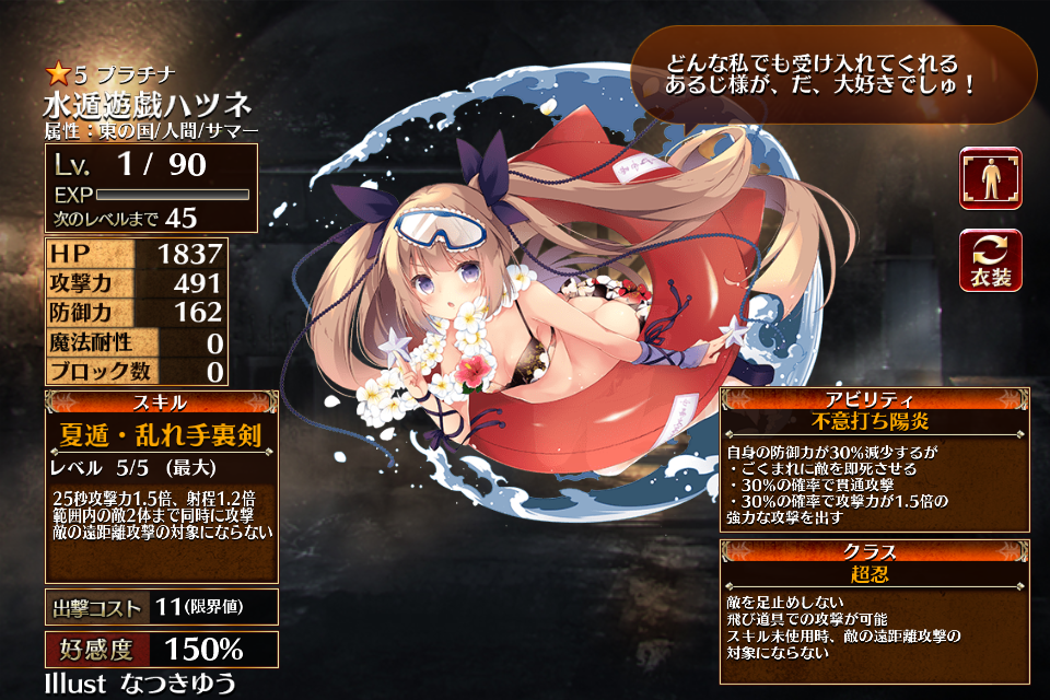 くノ一ハツネのサマー属性バージョンで、覚醒スキルのオリジナル同様常時隠密状態になれるのが特徴。