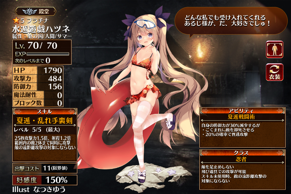 2022/07/07に水着プレミアム召喚限定ユニットとして実装されたレアリティプラチナの忍者。