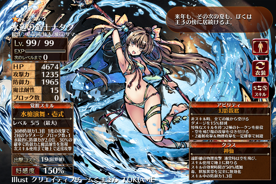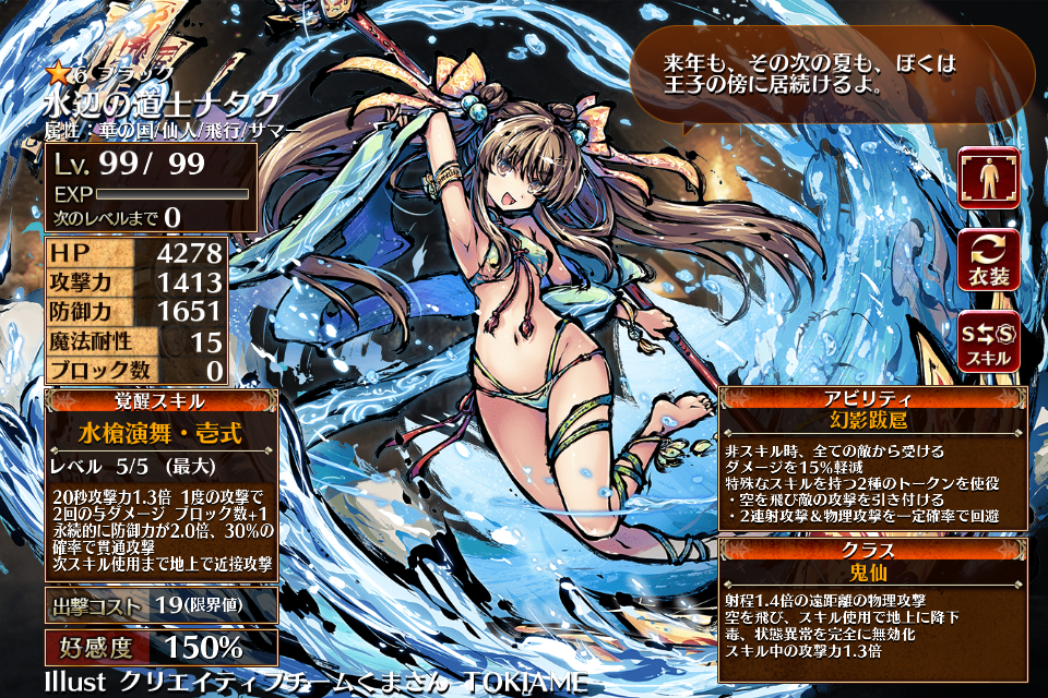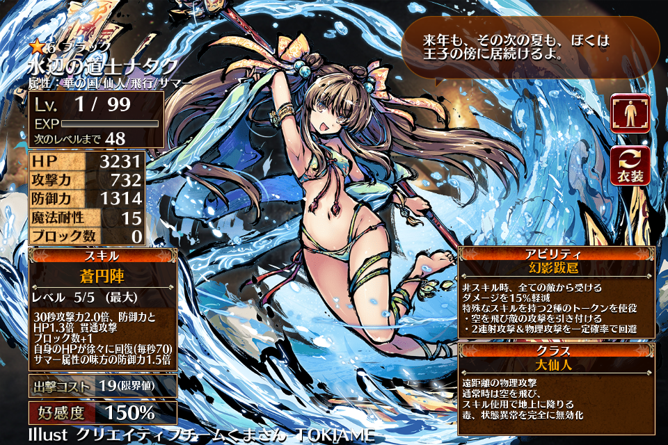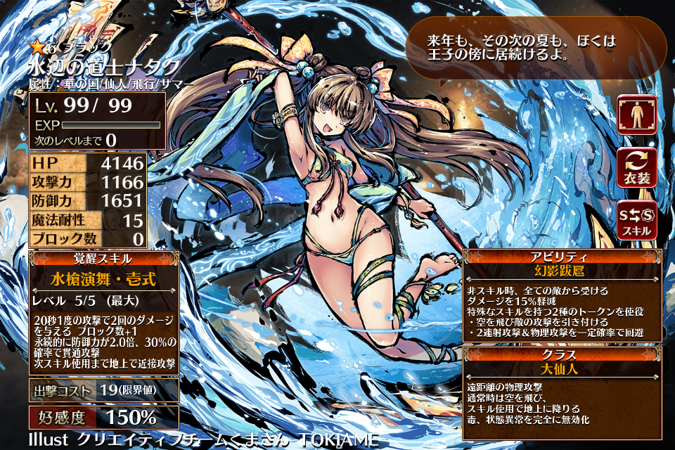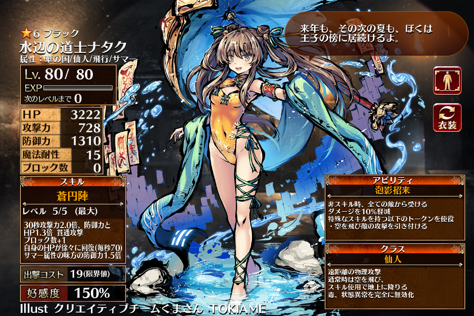 | Lv5 | 30秒攻撃力2.0倍、防御力とHP1.3倍 貫通攻撃 ブロック数+1 自身のHPが徐々に回復(毎秒70) サマー属性の味方の防御力1.5倍 | 銀 | 金 | 青 | 白 | 1 | 25 | |||