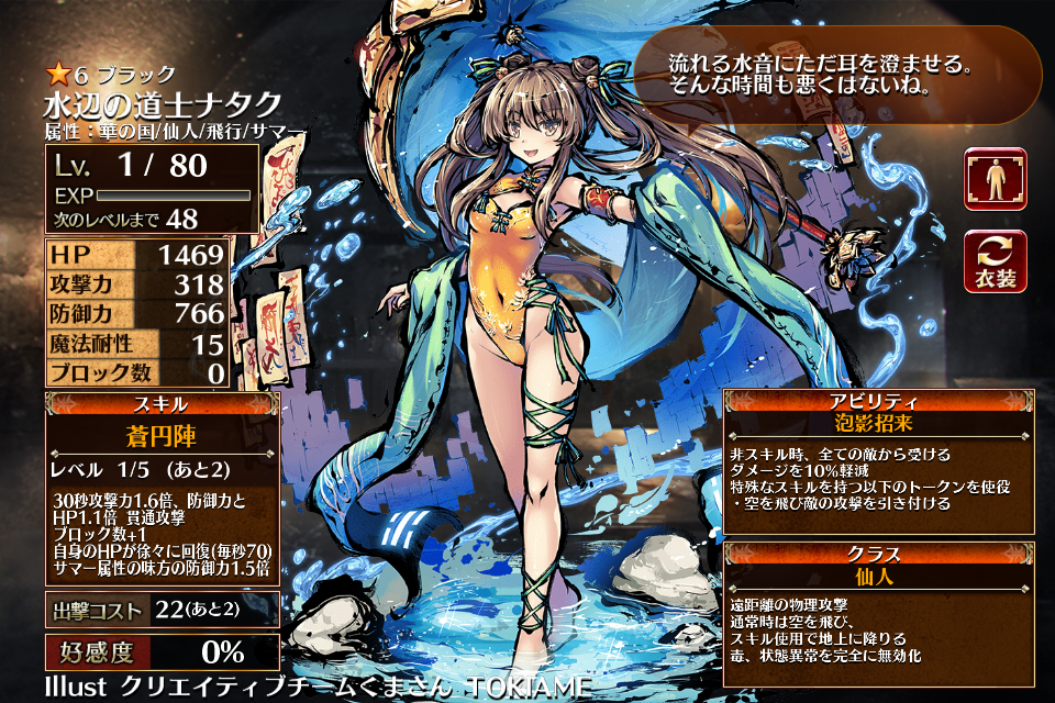 | 蒼円陣 | Lv1 | 30秒攻撃力1.6倍、防御力とHP1.1倍 貫通攻撃 ブロック数+1 自身のHPが徐々に回復(毎秒70) サマー属性の味方の防御力1.5倍 | 銀 | 金 | 青 | 白 | 1 | 29 | 水辺の道士ナタク | 編 集 |