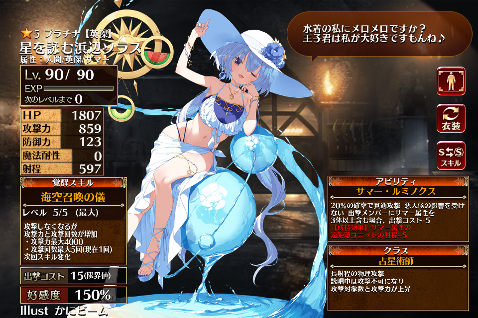 | 通常 | 夏空召喚の儀 | 攻撃しなくなるが、攻撃力と攻撃回数が増加 ・攻撃力最大2500 ・攻撃回数最大9回(現在1回) 次回スキル変化 | 初動まで1秒 | 回復まで2秒 |