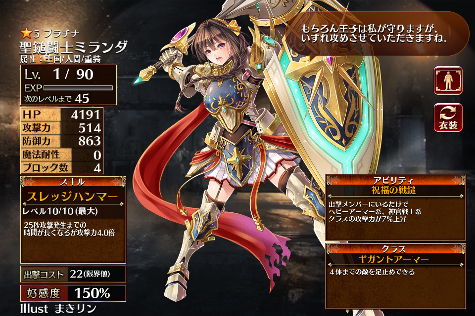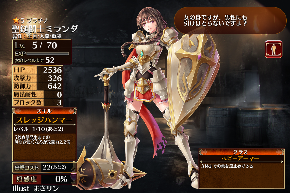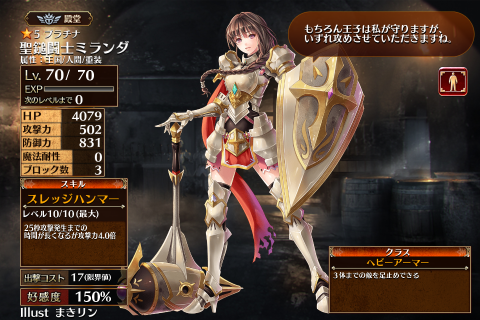 | プ ラ チ ナ | ![]() 聖鎚闘士ミランダ | ヘビーアーマー | Lv5 | 2536 | 326 | 642 | 0 | 3 | 22 | 17 | HP+540 攻撃力+108 HP+360 | スレッジハンマー | - | 編 集 |