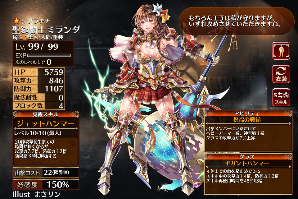 また立ち絵の装甲こそ薄くなるがスキル時に防御力が増加する効果が付くのも、攻撃型アーマーのミランダには嬉しい。