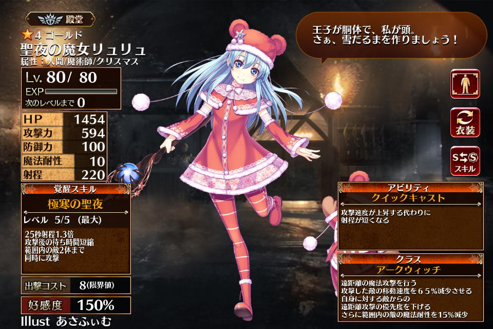 | 覚醒 | 極寒の聖夜 | 25秒射程1.3倍 攻撃後の待ち時間短縮 範囲内の敵2体まで同時攻撃 | 初動まで29秒 | 回復まで45秒 |