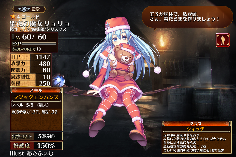 | ゴ | ル ド | ![]() 聖夜の魔女 リュリュ | ウィッチ | Lv1 | 925 | 242 | 55 | 10 | 250 | 8 | 5 | 攻撃力+132 スキル再使用時間-18% | マジックエンハンス | - | 編 集 |