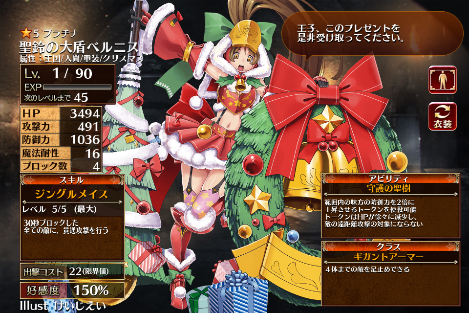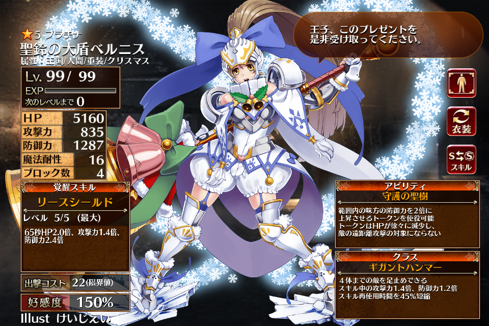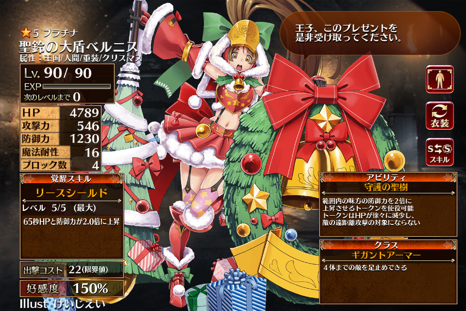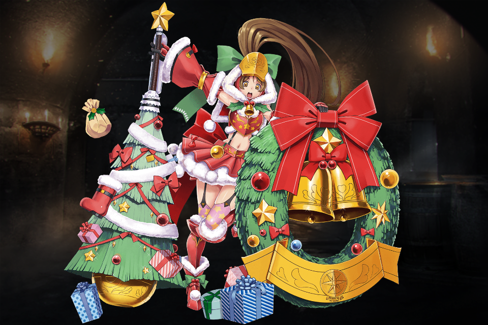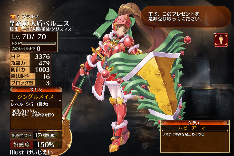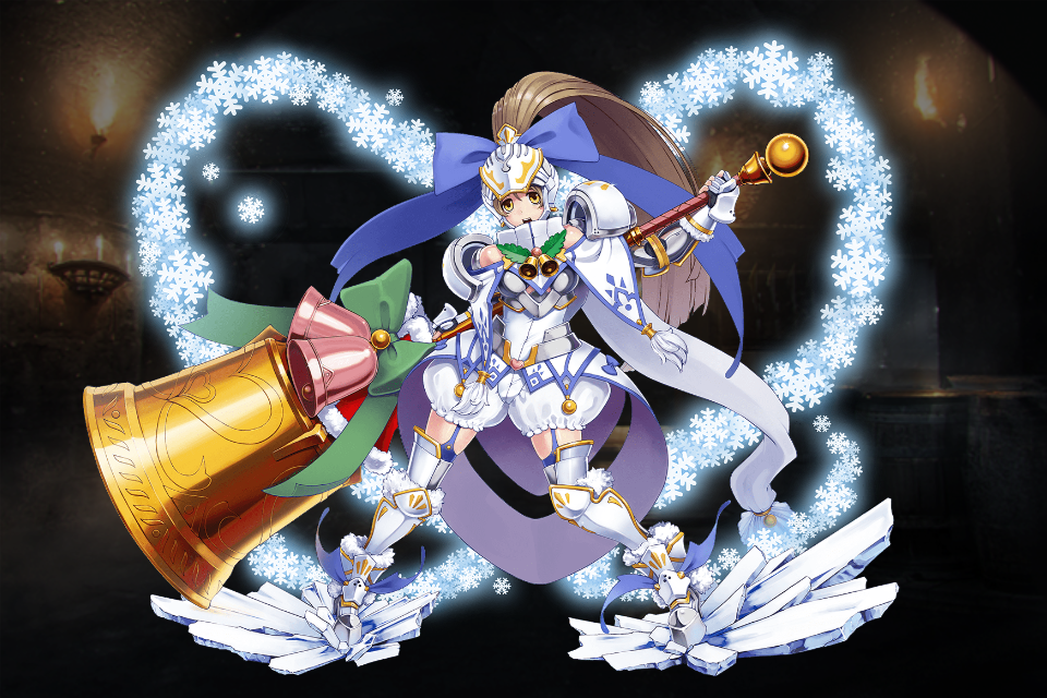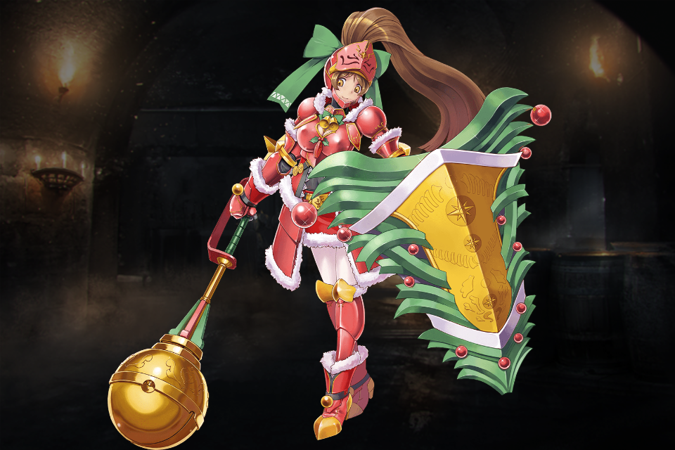 大盾の乙女ベルニスの別衣装・クリスマス属性&レアリティ昇格版。彼女にしては珍しく肌色面積の多い鎧である。