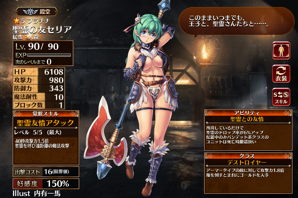 | 覚醒 | 聖霊友情アタック | 40秒攻撃力1.5倍 聖霊を呼び遠距離の魔法攻撃 | 初動まで25秒 | 回復まで50秒 |