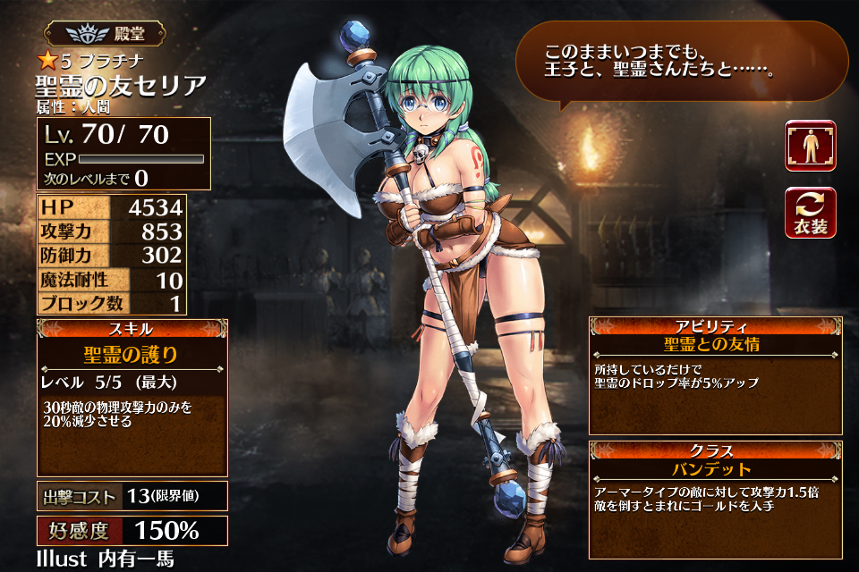 | プ ラ チ ナ | ![]() 聖霊の友セリア | バンデット | Lv1 | 3116 | 663 | 176 | 10 | 1 | 16 | 13 | HP+720 防御力+72 スキル再使用時間-20% | 聖霊の護り | 聖霊との友情*1 | 編 集 |