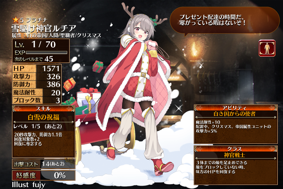 | プ ラ チ ナ | ![]() 雪駆け神官ルチア | 神官戦士 | Lv1 | 1571 | 326 | 386 | 20 | 3 | 14 | 11 | HP+360 防御力+144 攻撃力+72 | 白雪の祝福 | 白き国からの使者 | 編 集 |