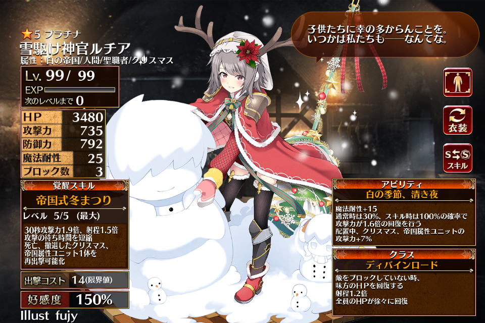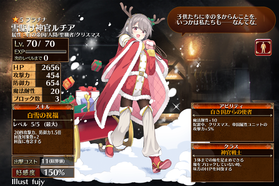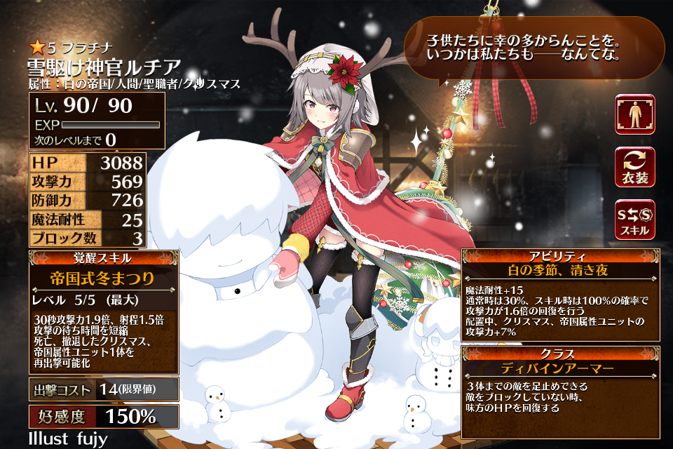 | 通常 | 白雪の祝福 | 20秒攻撃力、防御力1.5倍 回復対象+2 回復に専念する | 初動まで12秒 | 回復まで25秒 |