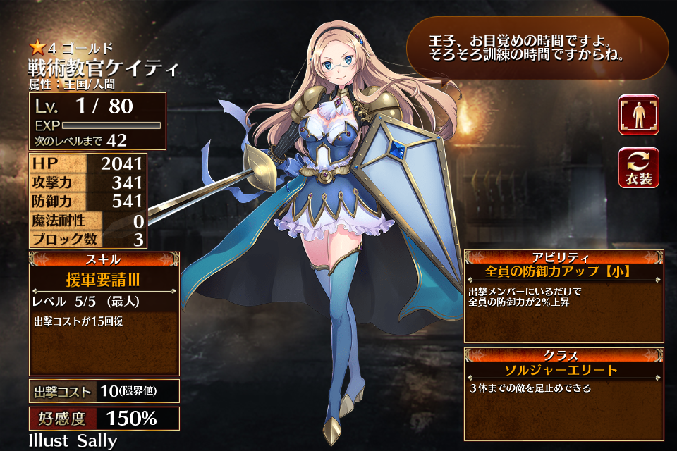 編成するだけで全員の防御力を2%上昇させ、なおかつ王子の士気高揚や他ユニットの類似アビリティと累積強化される。