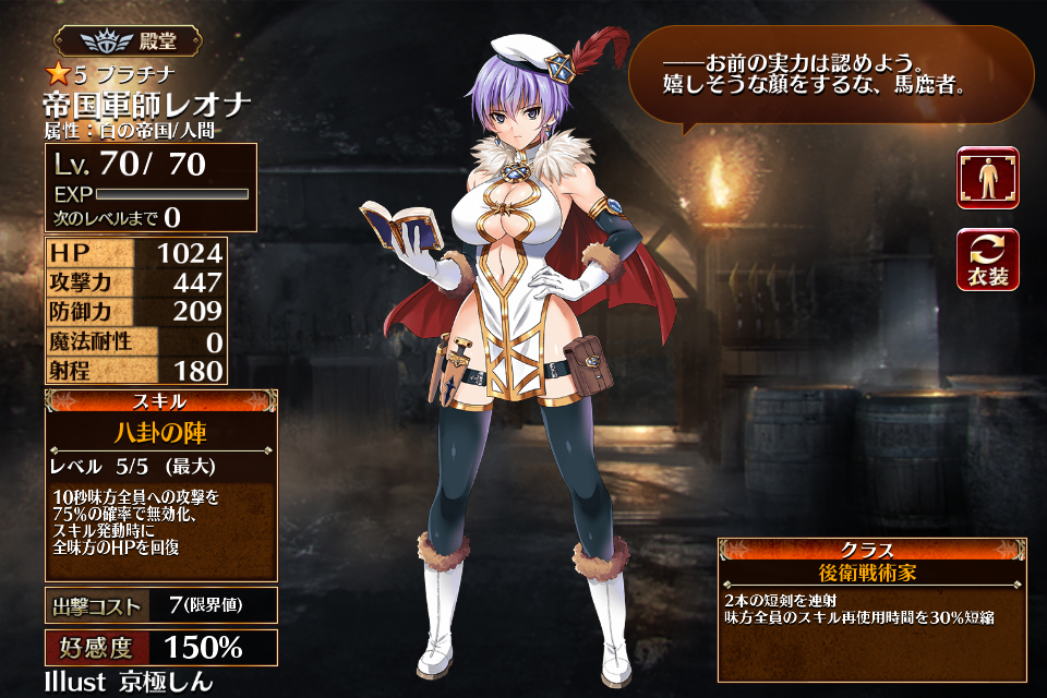 | 八卦の陣 | Lv1 | 5秒全ての味方への攻撃を75%の確率で無効化、スキル発動時に味方全員のHPを回復 | - | - | - | 29 | - | 59 | ちびレオナ 帝国軍師レオナ | 編 集 |