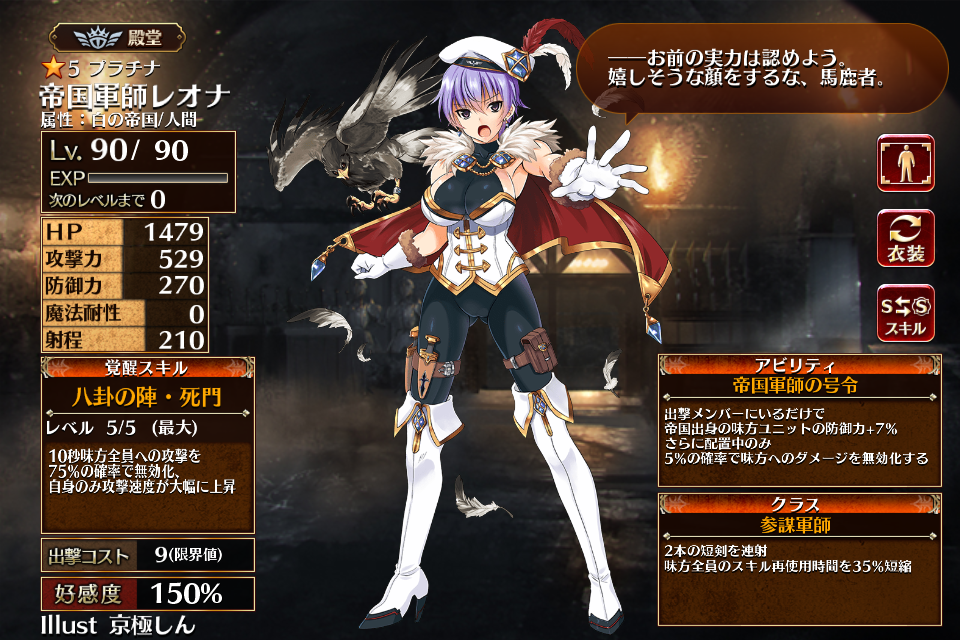 覚醒アビリティは「帝国軍師の号令」、出撃メンバーにいるだけで「属性:白の帝国」ユニットの防御力+7%、さらに配置中のみ5%の確率で全味方へのダメージを無効化。