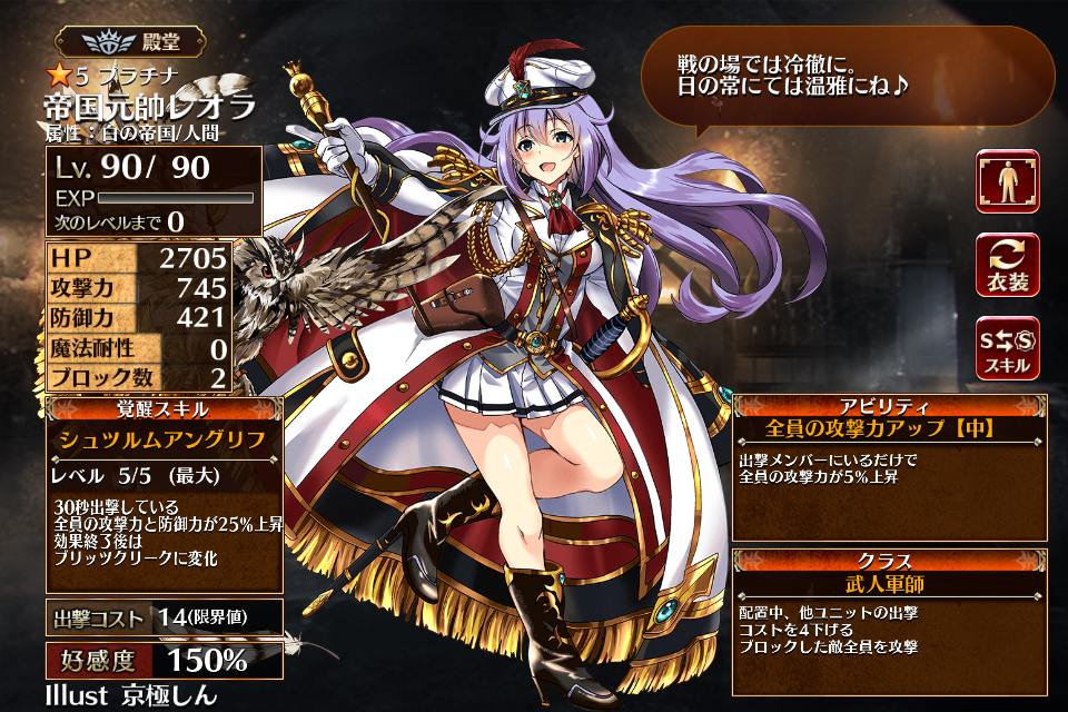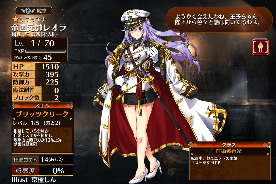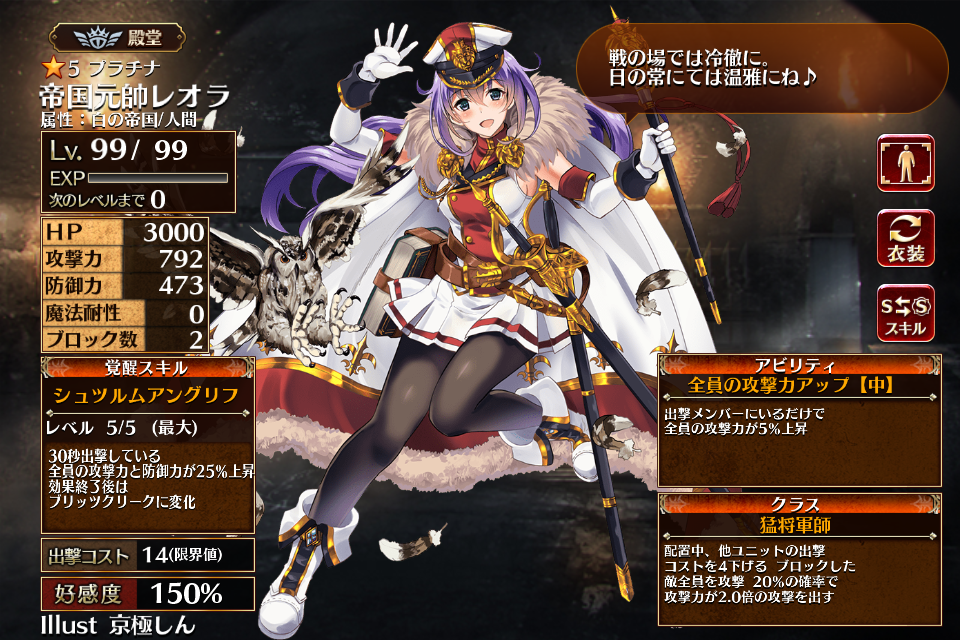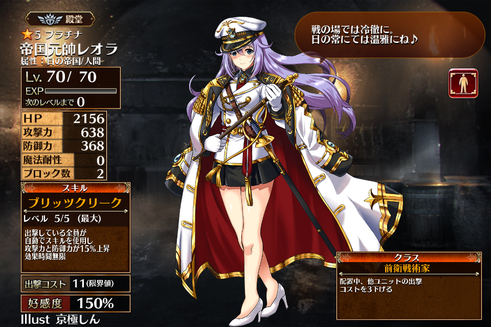 2017/03/23に帝国プレミアム召喚に実装された5人目の前衛戦術家。レアリティはプラチナ。