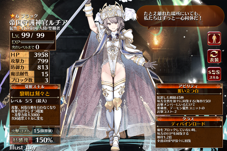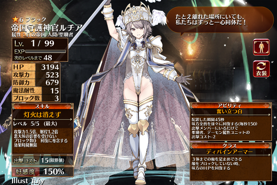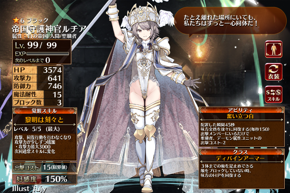 | ブ ラ ッ ク | ![]() 帝国守護神官 ルチア | 神官戦士 | Lv1 | 1676 | 331 | 435 | 15 | 3 | 15 | 12 | HP+630 攻撃力+126 防御力+84 | 灯火は消えず | 命を背中に | 編 集 |