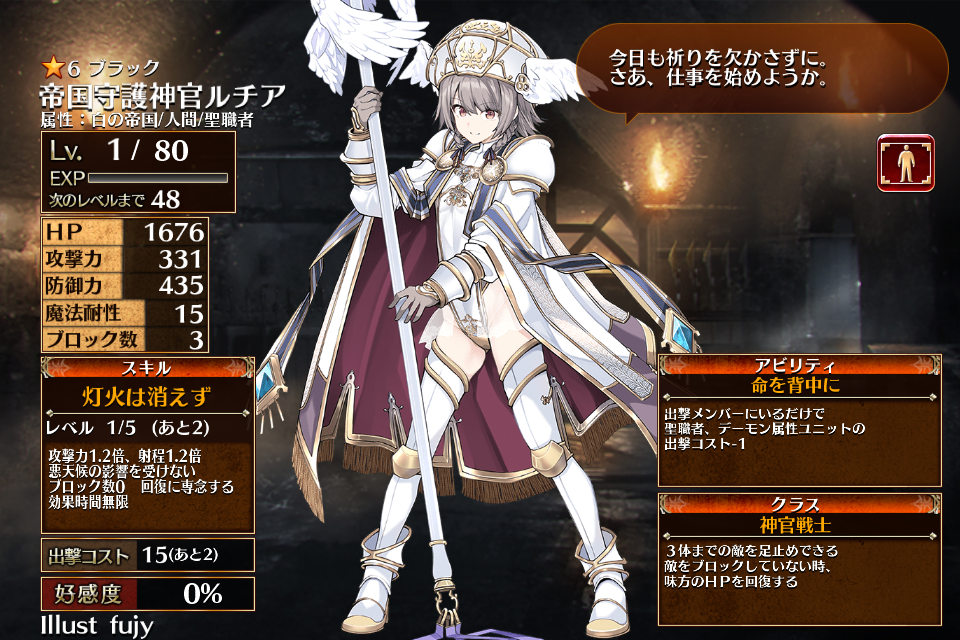 | 灯火は消えず | Lv1 | 攻撃力1.2倍、射程1.2倍 悪天候の影響を受けない ブロック数0 回復に専念する 効果時間無限 | 銀 | 金 | 青 | 白 | 1 | 64 | 帝国守護神官ルチア | 編 集 |