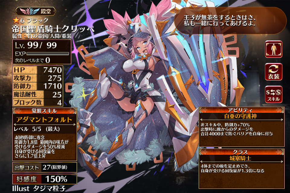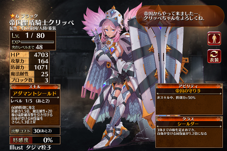 | ブ ラ ッ ク | ![]() 帝国聖盾騎士 クリッペ | シールダー | Lv1 | 4703 | 164 | 1071 | 25 | 3 | 30 | 27 | HP+672 防御力+134 HP+450 | アダマントシールド | 帝国の守り手 | 編 集 |