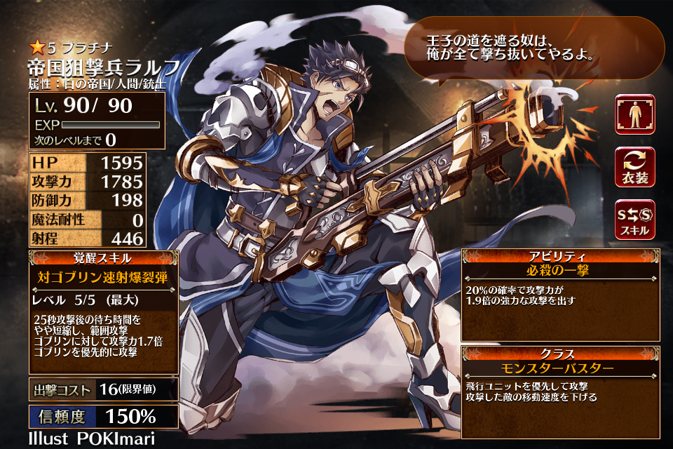 | プ ラ チ ナ | ![]() 帝国狙撃兵ラルフ | モンスター スレイヤー | Lv1 | 787 | 915 | 37 | 0 | 430 | 19 | 16 | 攻撃力+72 防御力+36 射程+16 | 対ゴブリン速射弾 | - | 編 集 |