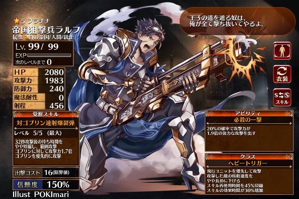 | 対ゴブリン速射弾 | Lv1 | 20秒攻撃後の待ち時間をやや短縮、ゴブリンに対して攻撃力1.9倍 ゴブリンを優先的に攻撃 | - | 26 | - | 20 | - | 39 | 帝国狙撃兵ラルフ ちびラルフ | 編 集 |