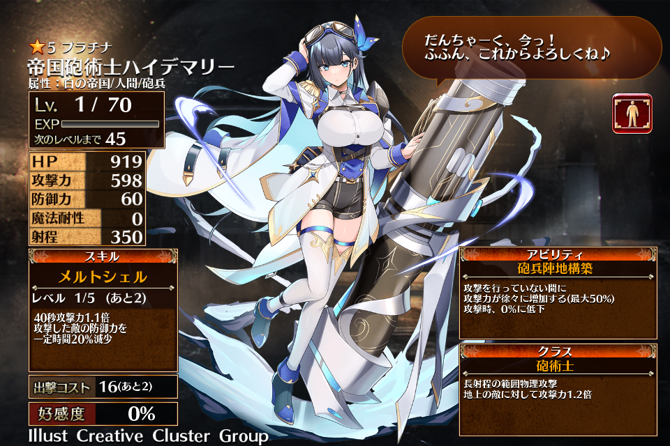 | プ ラ チ ナ | ![]() 帝国砲術士 ハイデマリー | 砲術士 | Lv1 | 919 | 598 | 60 | 0 | 350 | 16 | 13 | HP+360 攻撃力+144 攻撃力+72 | メルトシェル | 砲兵陣地構築 | 編 集 |