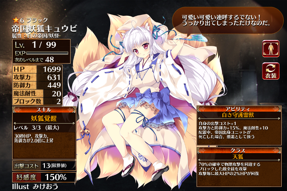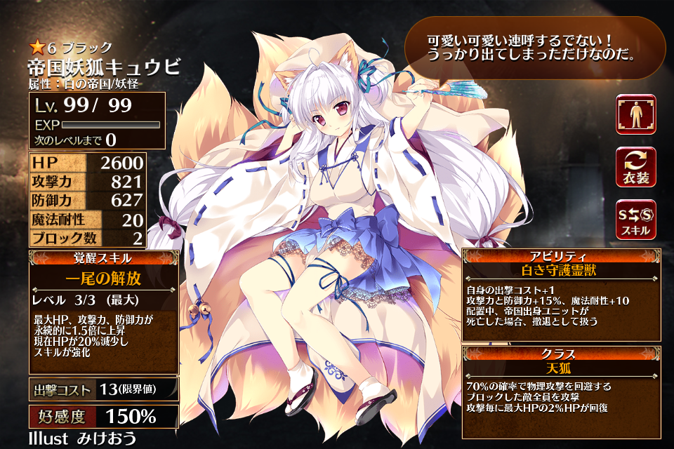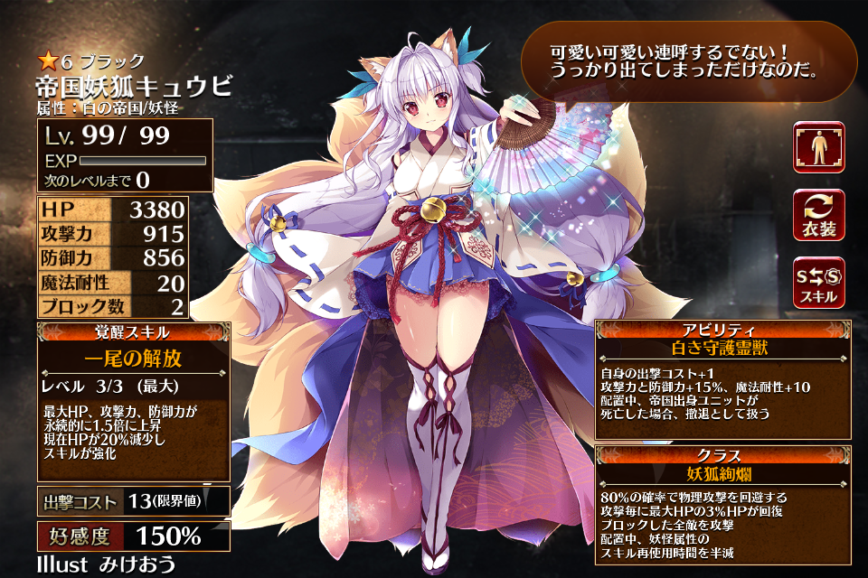 覚醒前アビリティ「九尾の狐」が少し曲者で、HP・攻撃・防御・魔法耐性が強化される代わりに、出撃コストが増加してしまう。