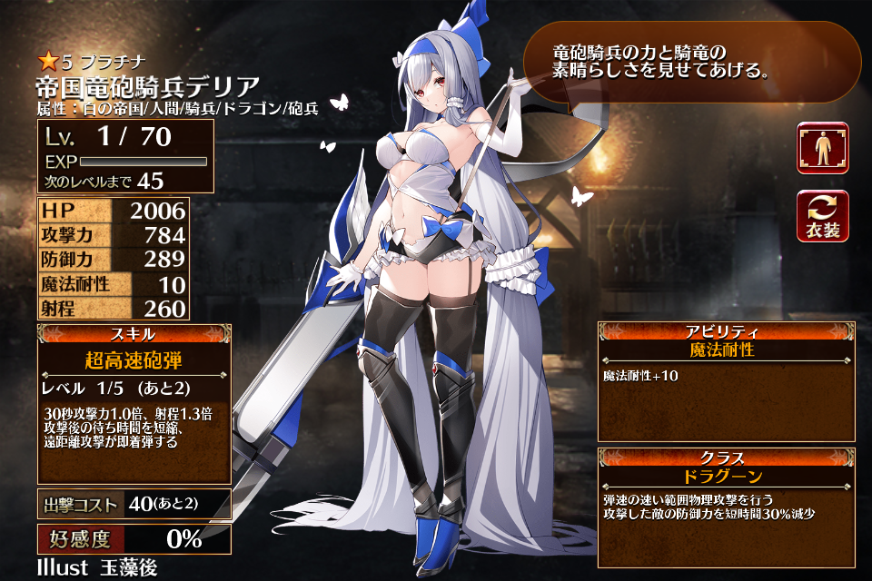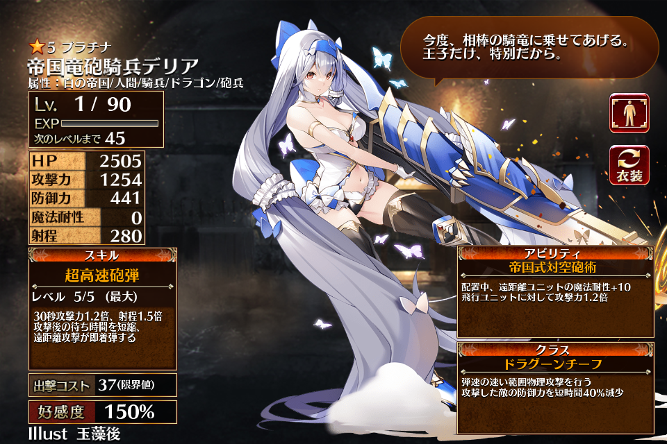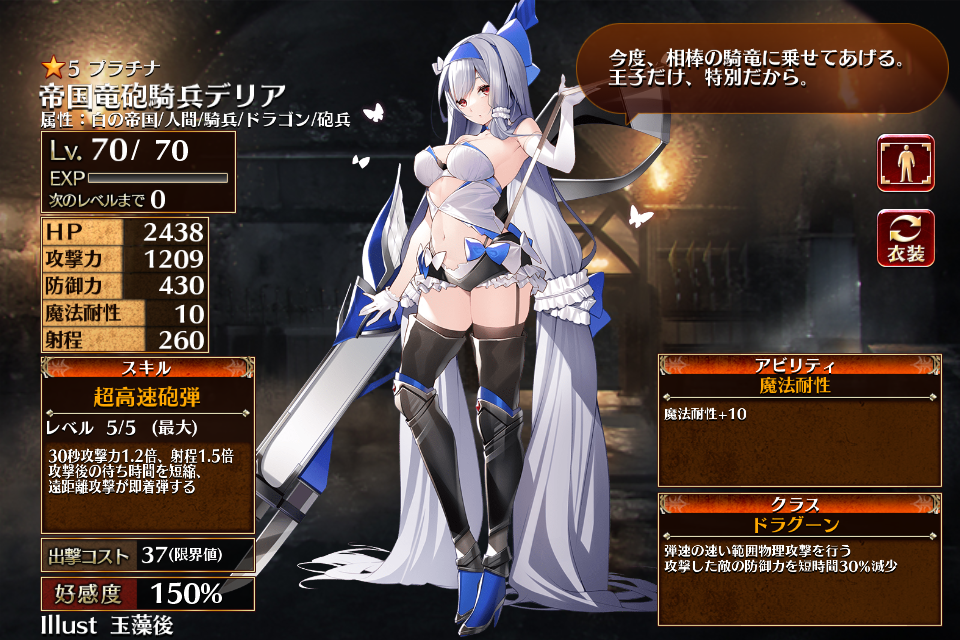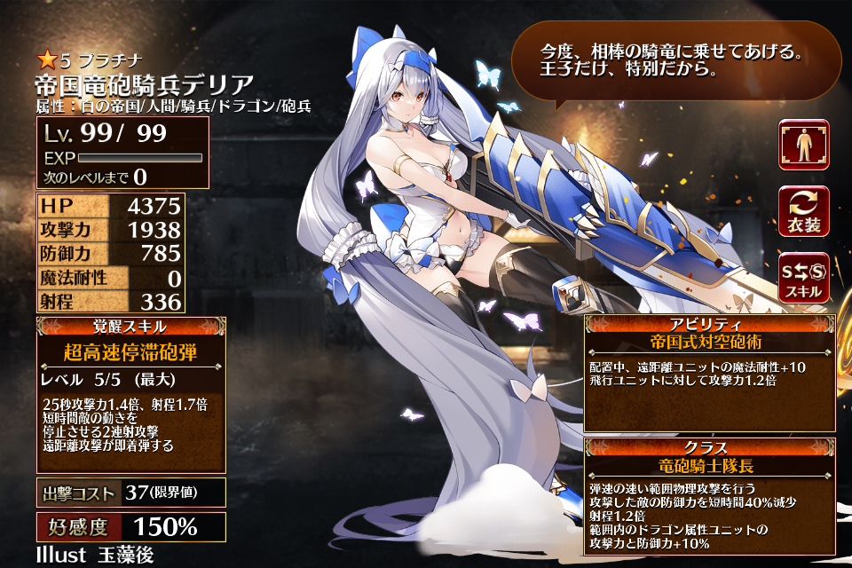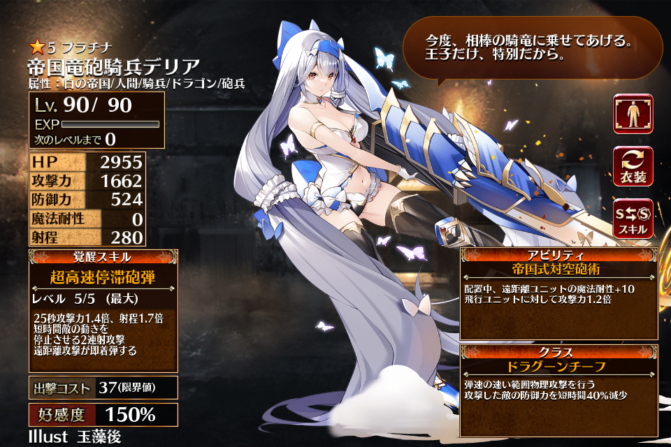 | プ ラ チ ナ | ![]() 帝国竜砲騎兵 デリア | ドラグーン | Lv1 | 2006 | 784 | 289 | 10 | 260 | 40 | 37 | 攻撃力+144 防御力+72 スキル再使用時間-20% | 超高速砲弾 | 魔法耐性 | 編 集 |