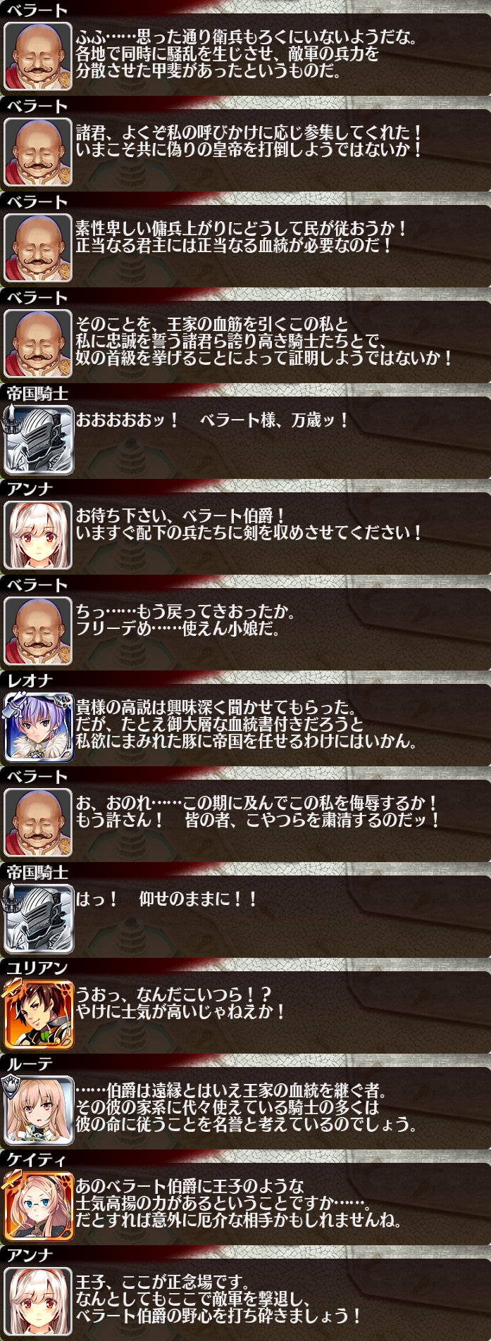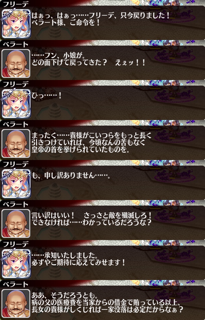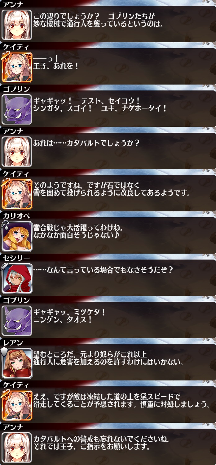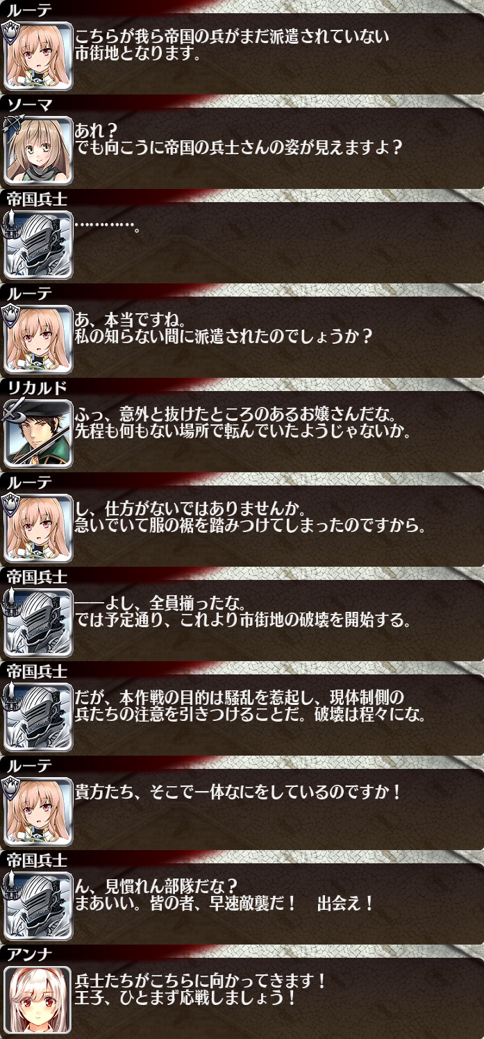 | 帝都を覆う暗雲 | 25 | 1050 | 30 | 35 | 一般兵A【重装】Lv5x2 | 銅聖霊サラ | 樽ビール | |
