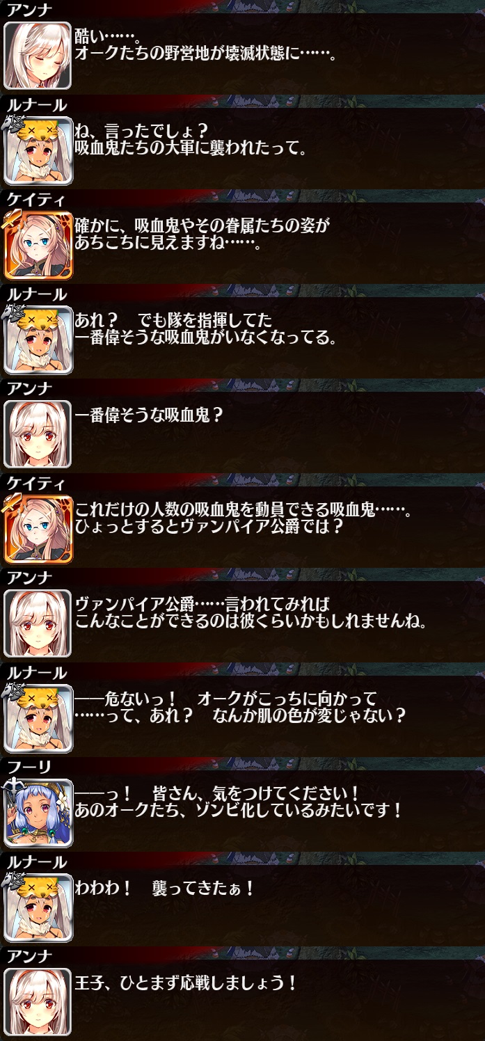 | オークゾンビ・パニック | 75 | 2000 | 25 | 75 | 帝国神官戦士ルチアLv15 | オークの格闘家ベストラLv15 | 密林の槍騎兵チグリLv15 | |