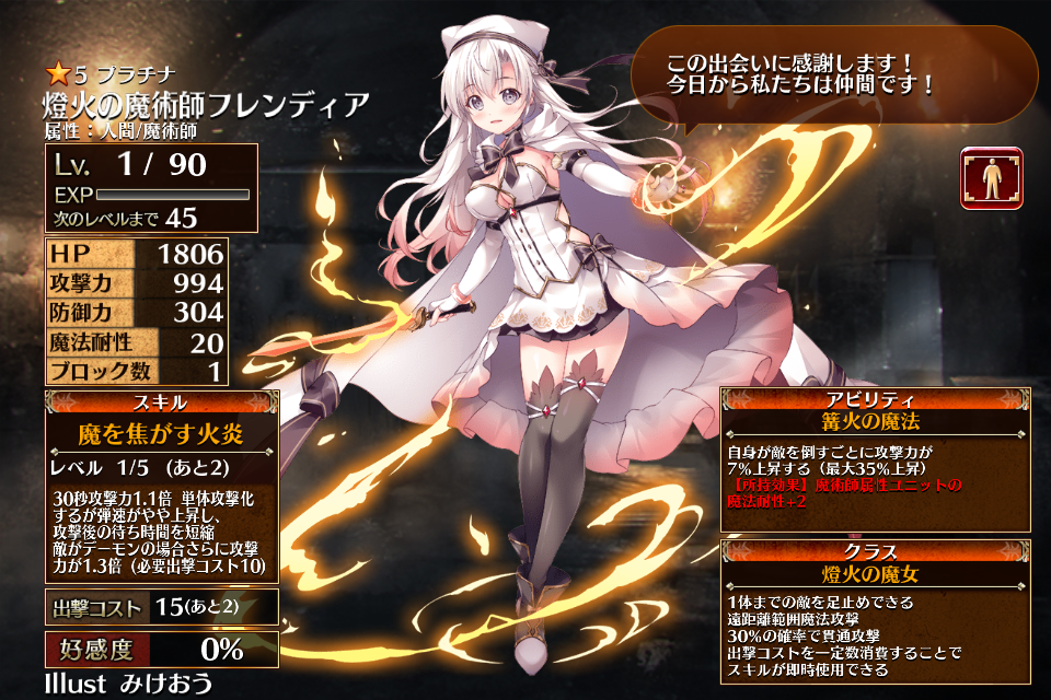 | 魔を焦がす火炎 | Lv1 | 30秒攻撃力1.1倍 単体攻撃化するが弾速がやや上昇し、攻撃後の待ち時間を短縮 敵がデーモンの場合さらに攻撃力が1.3倍(必要出撃コスト10) | 銀 | 金 | 青 | 0 | 黒 | 0 | 燈火の魔術師フレンディア【プラチナ】 | 編 集 |