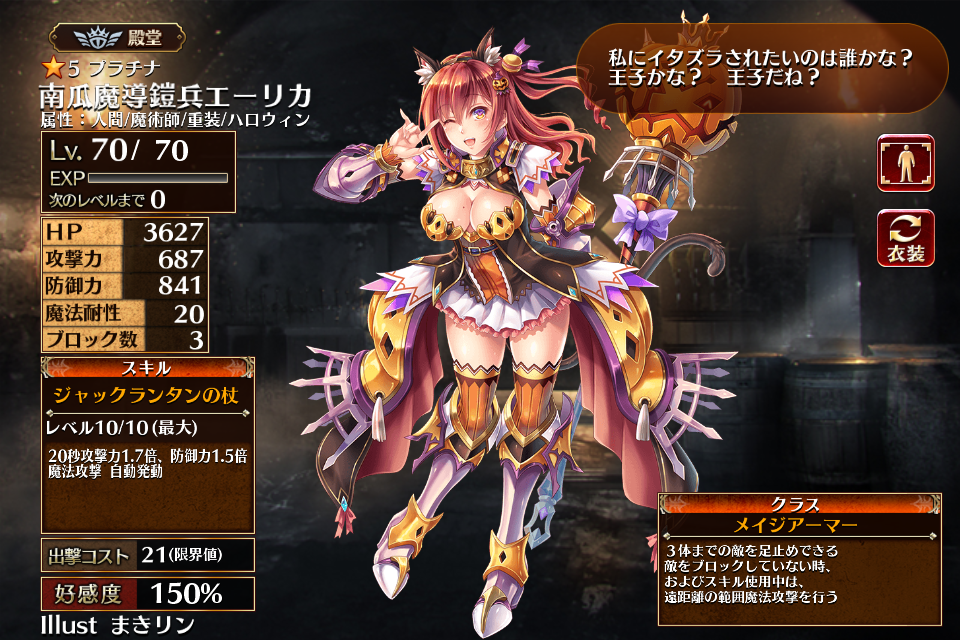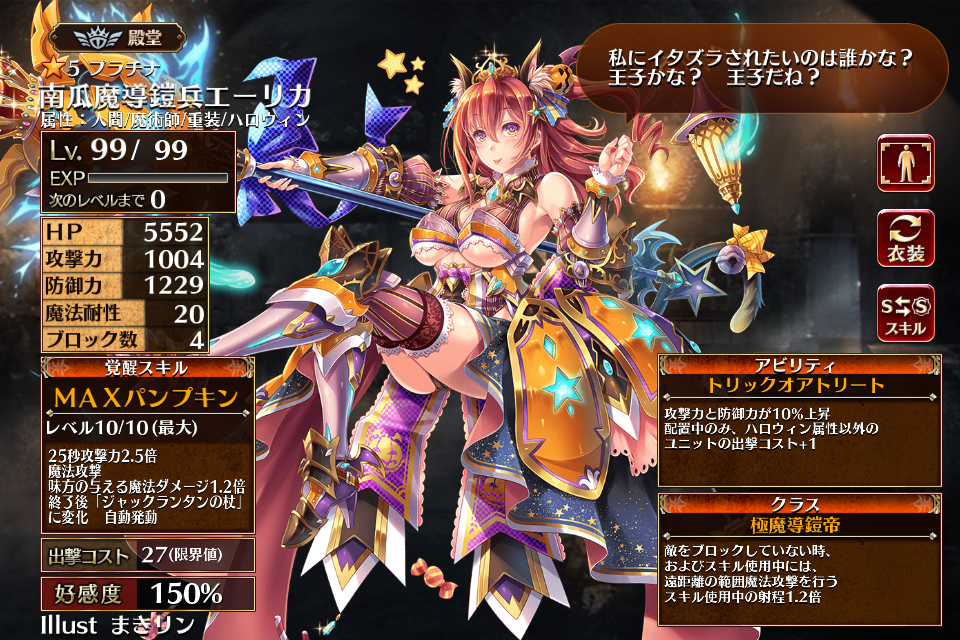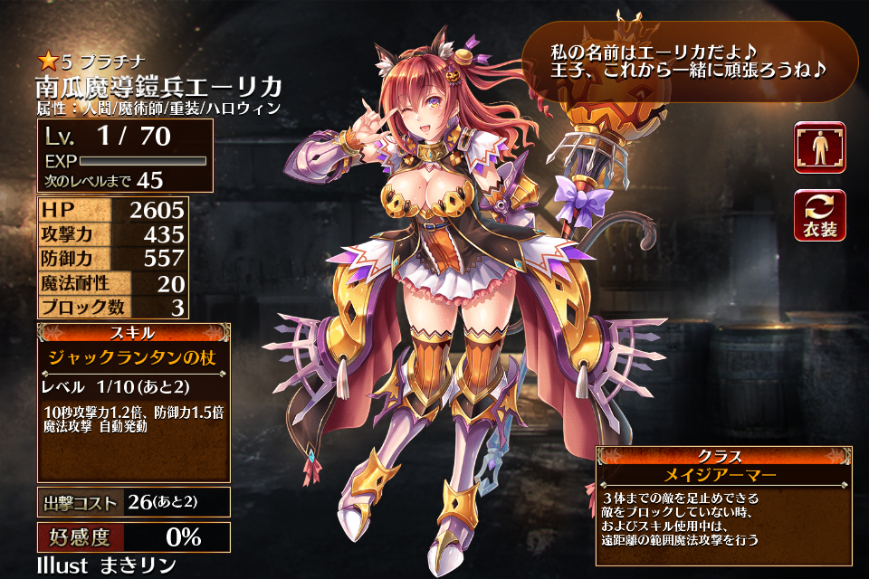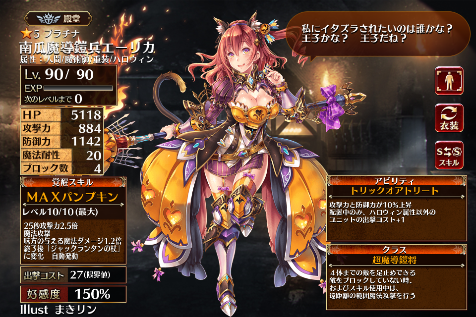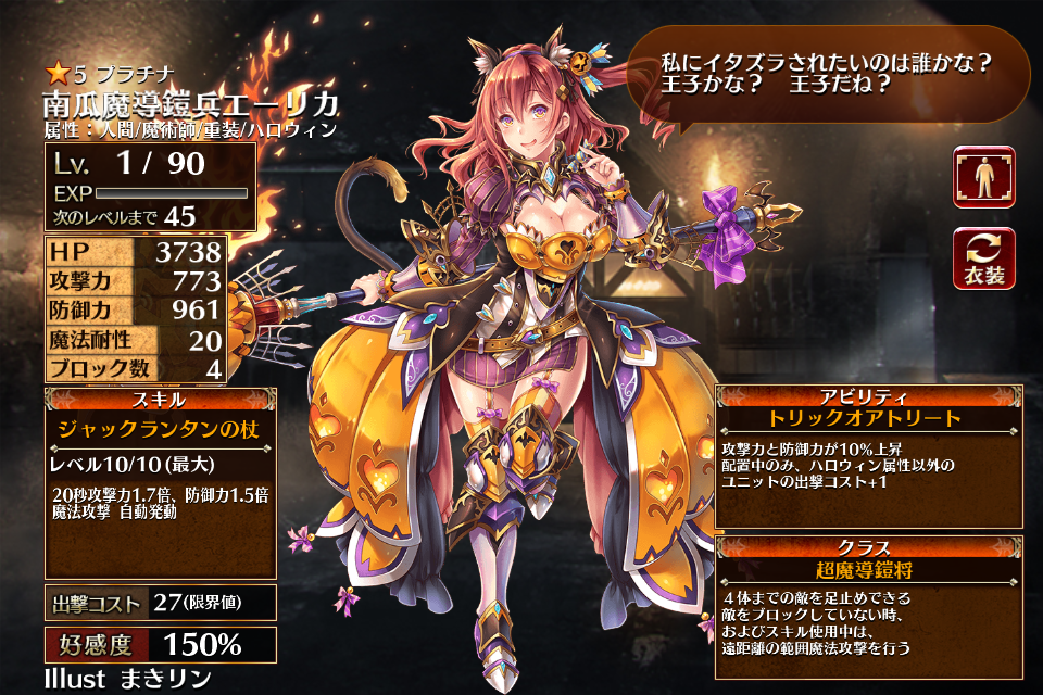 覚醒アビリティ「トリックオアトリート」により自身の攻撃力と防御力が10%上がる*1が、エーリカ配置中はハロウィン属性以外のユニットの出撃コストが+1される。