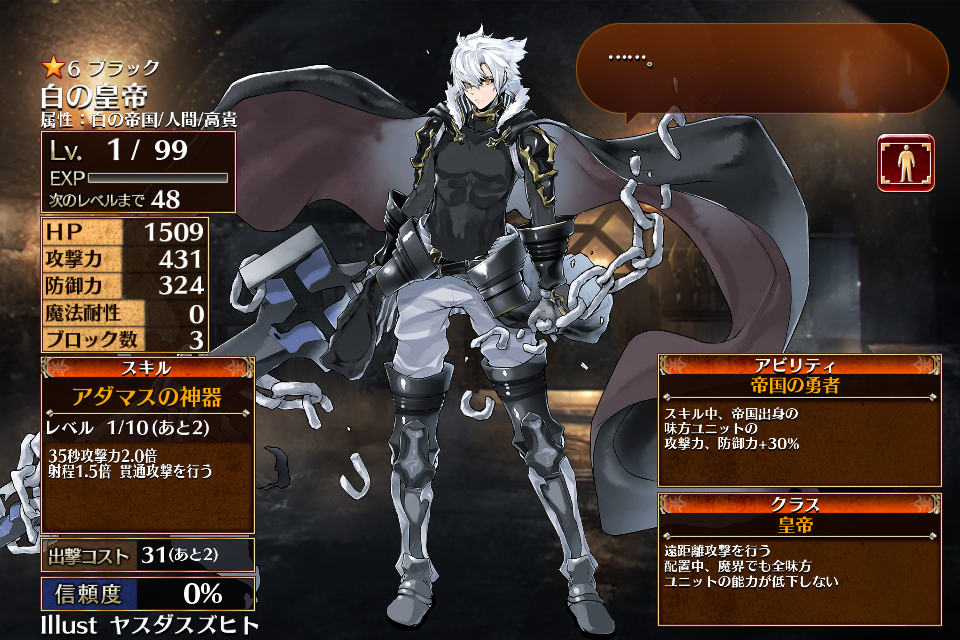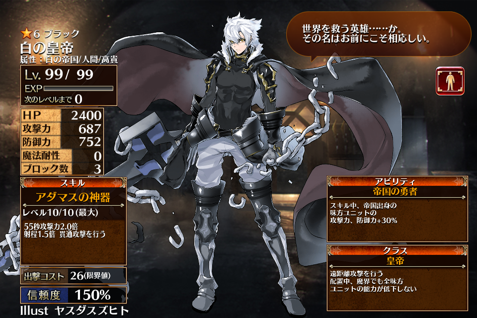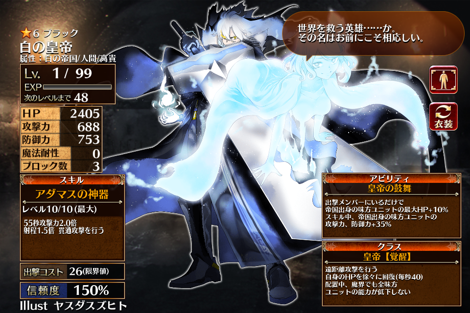 3周年記念の試練型緊急ミッション「女神の封印」の報酬として2016/12/08に配布された、白の帝国の皇帝。
