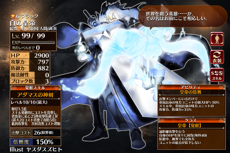 HPが低めという皇帝自身の弱点が多少カバーされ、性能としては覚醒前の完全上位となる。スキル覚醒が解放されるのも魅力。