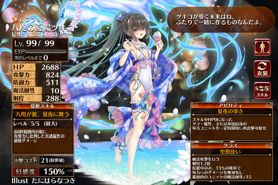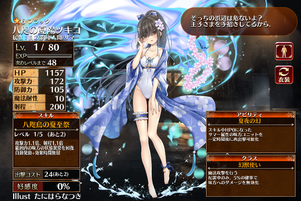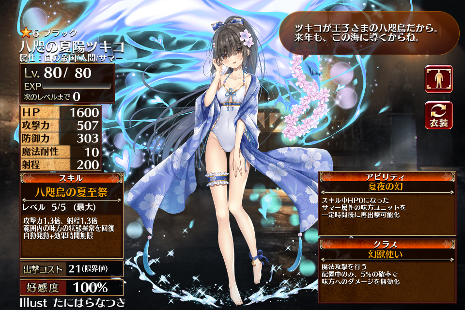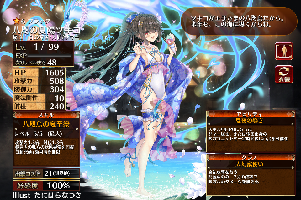 | ブ ラ ッ ク | ![]() 八咫の夏陽ツキコ | 幻獣使い | Lv1 | 1157 | 172 | 105 | 10 | 200 | 24 | 21 | 攻撃力+180 防御力+108 攻撃力+90 | 八咫烏の夏至祭 | 夏夜の幻 | 編 集 |