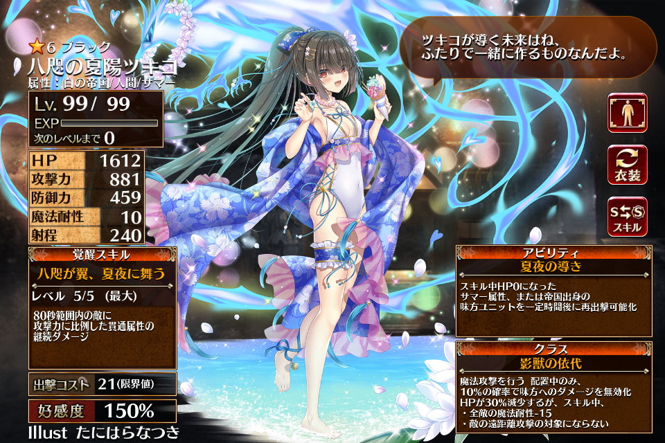 | 覚醒 | 八咫が翼、夏夜に舞う | 80秒範囲内の敵に攻撃力に比例した防御力と魔法耐性無視の継続ダメージ | 初動まで5秒 | 回復まで60秒 |