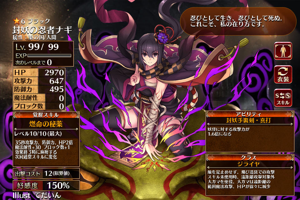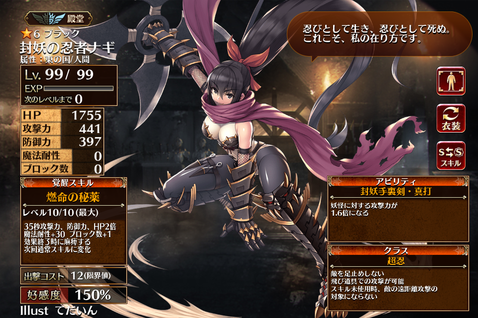 | ブ ラ ッ ク | ![]() 封妖の忍者ナギ | 忍者 | Lv1 | 1220 | 234 | 173 | 0 | 0 | 17 | 12 | 攻撃力+126 防御力+126 物理攻撃回避+28% | 秘伝の丸薬 | 封妖手裏剣 | 編 集 |