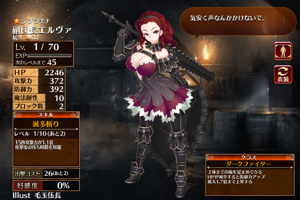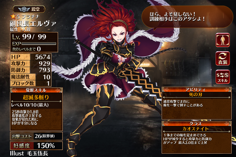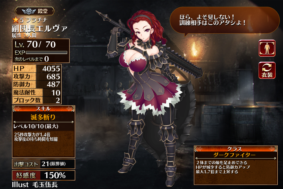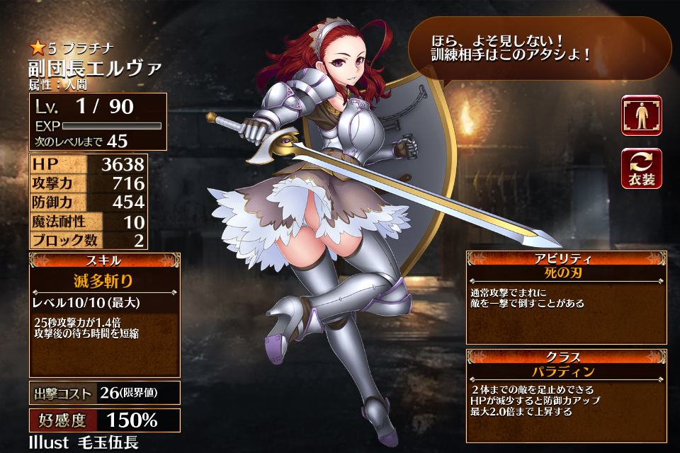 | プ ラ チ ナ | ![]() 副団長エルヴァ | ダークファイター | Lv1 | 2246 | 372 | 392 | 10 | 2 | 26 | 21 | HP+540 攻撃力+108 HP+360 | 滅多斬り | - | 編 集 |