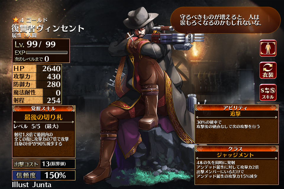 さらに信頼度を150%まで上げれば射程が+14され、ヴァンパイアハンターながら射程で困る場面はかなり少なくなる。