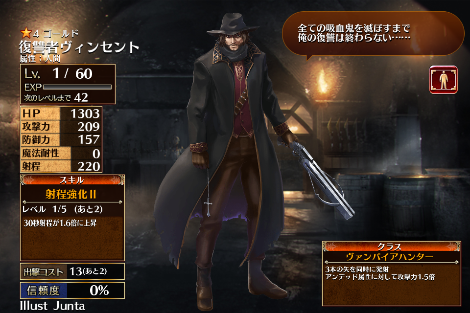 | ゴ | ル ド | ![]() 復讐者 ヴィンセント | ヴァンパイア ハンター | Lv1 | 1303 | 209 | 157 | 0 | 220 | 13 | 10 | 攻撃力+66 射程+14 | 射程強化II | - | 編 集 |